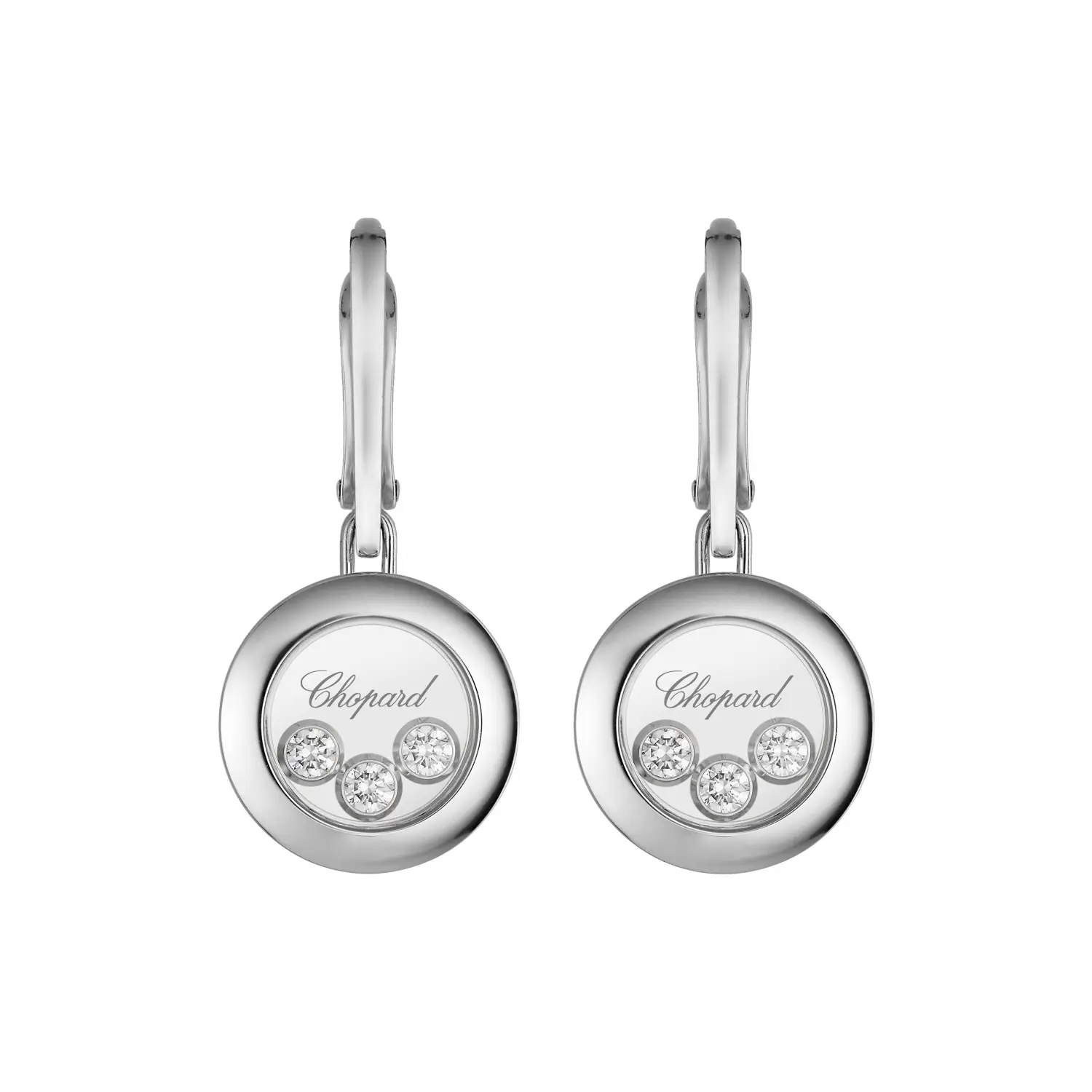 这款 Chopard Happy Diamonds Icons 83A018-1301 耳饰展现了纯粹的优雅与光影之美。采用 18K 道德白金 制作,镶嵌 可自由舞动的明亮式切割钻石(总重约 0.30 克拉),钻石在两片蓝宝石水晶之间灵动闪耀——这是 Happy Diamonds 系列的标志性设计,象征 自由、快乐与女性魅力。