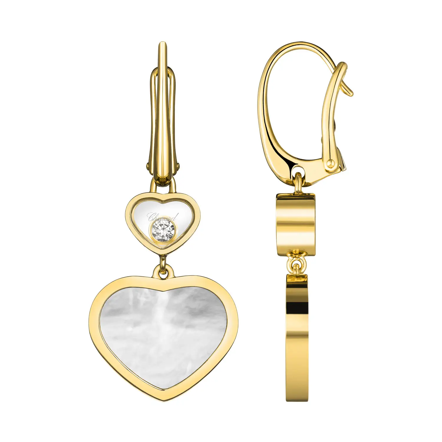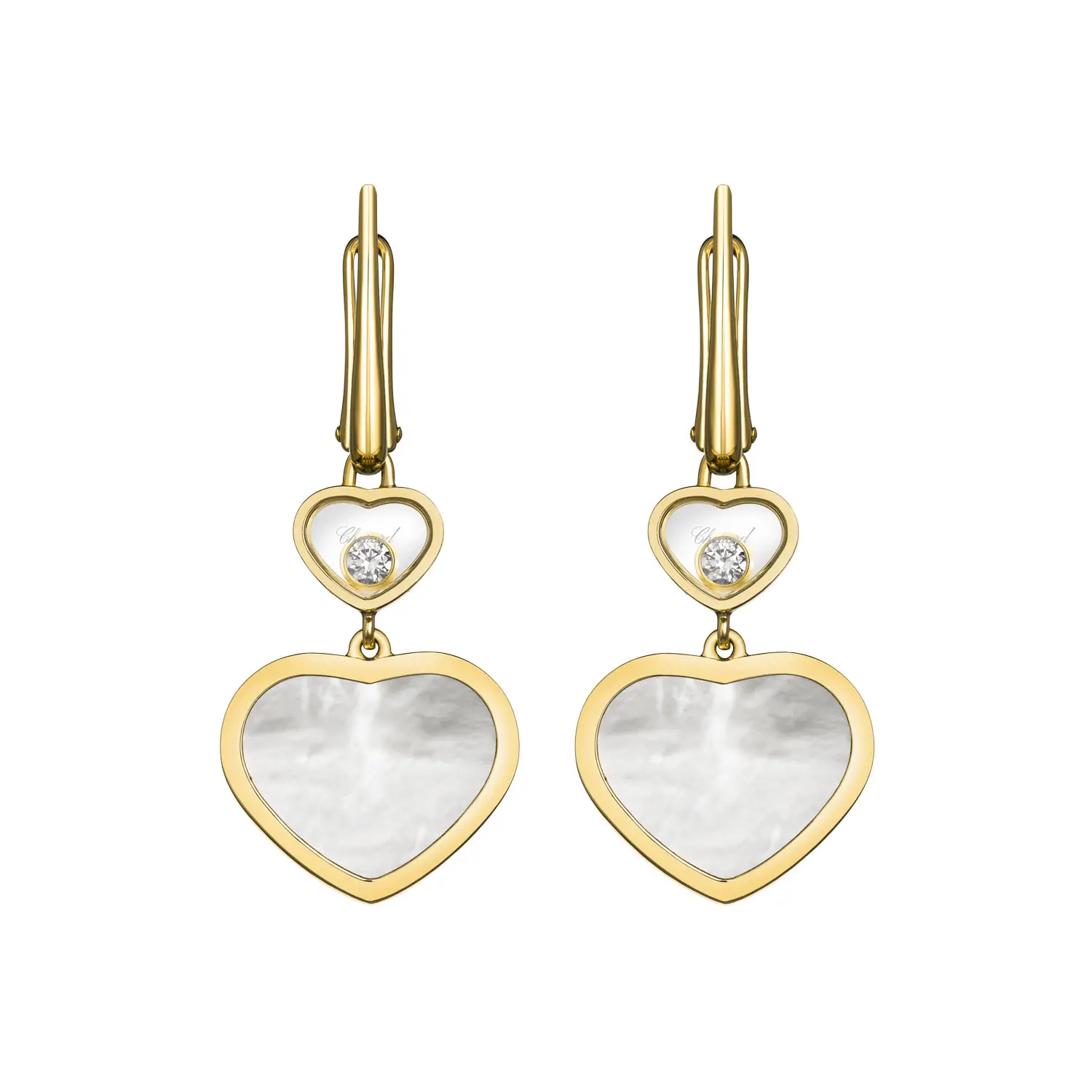 耳环采用 18K 黄金 (750/1000) 制作,并配以高抛光表面,展现出优雅与精湛工艺。其醒目的 垂坠心形造型 带来动感却柔美的视觉效果。每颗心饰以 天然白色珍珠母贝,能美丽地反射光线,为耳环增添柔和光泽。
