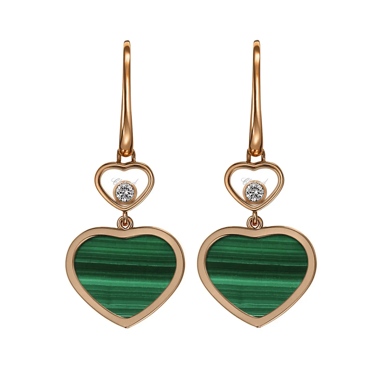 萧邦 Chopard Happy Hearts 837482-5111 耳环展现 女性优雅与愉悦奢华。采用 18K 道德玫瑰金 制成,饰以 绿色孔雀石心形图案 与 白色钻石(总重 0.10 克拉),钻石可自由旋转,闪耀灵动光彩。