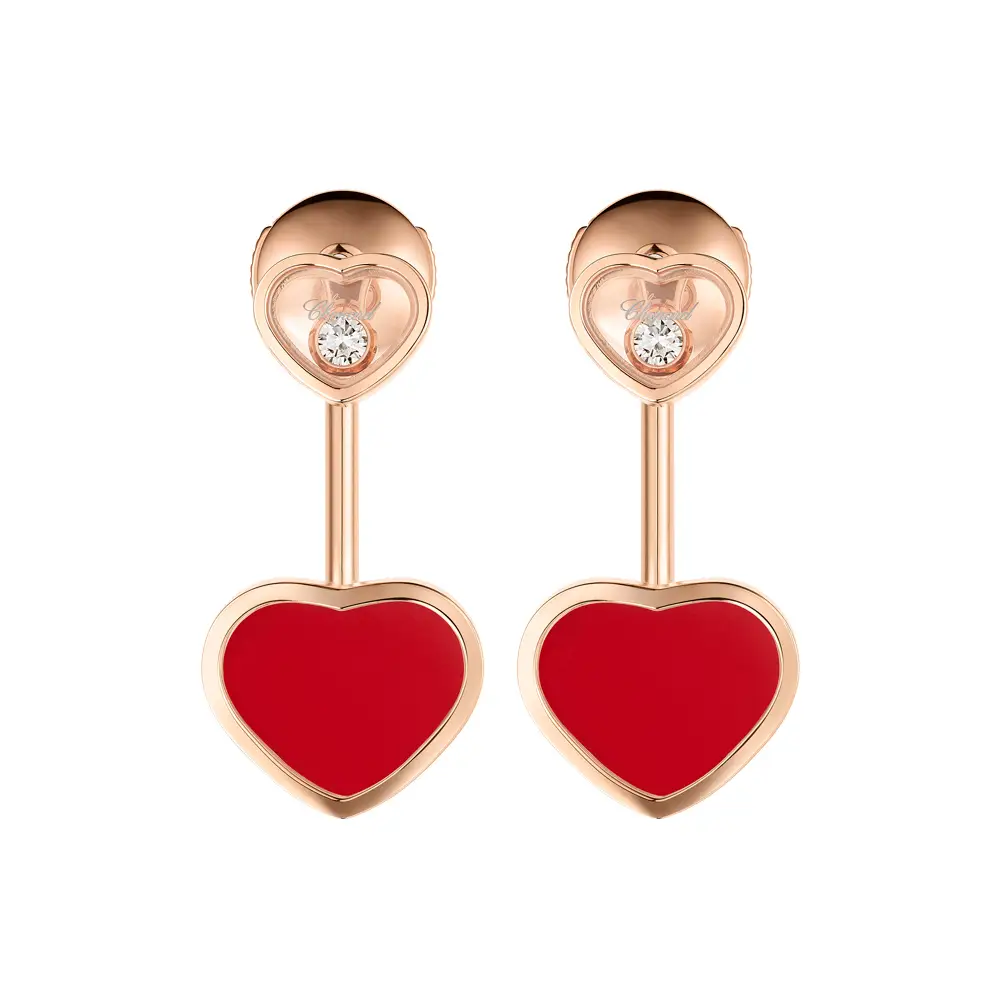 视觉焦点为 2 颗心形(Heart)鲜红色主石,带来独特点睛。并以 总重 0.08 ct 的钻石(2 颗)增添光彩,圆形切工 / Round、白色(来源:天然),净度 IF–VVS、色级 F–G。精细镶嵌强化宝石火彩与线条的纯净感——成就一对经典、女性且醒目的耳环,易与其他 Chopard 珠宝叠搭。