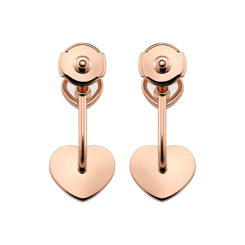 Chopard Happy Hearts 83A082-5801 为短款垂坠式耳环,将俏皮的心形元素与柔美气质相融合。采用 18K 玫瑰金(750/1000)打造,抛光表面与大尺寸主石设计,使其举手投足皆吸睛。配备耳钉配蝴蝶扣(push-back),佩戴稳固舒适,适合日常与礼服场合。