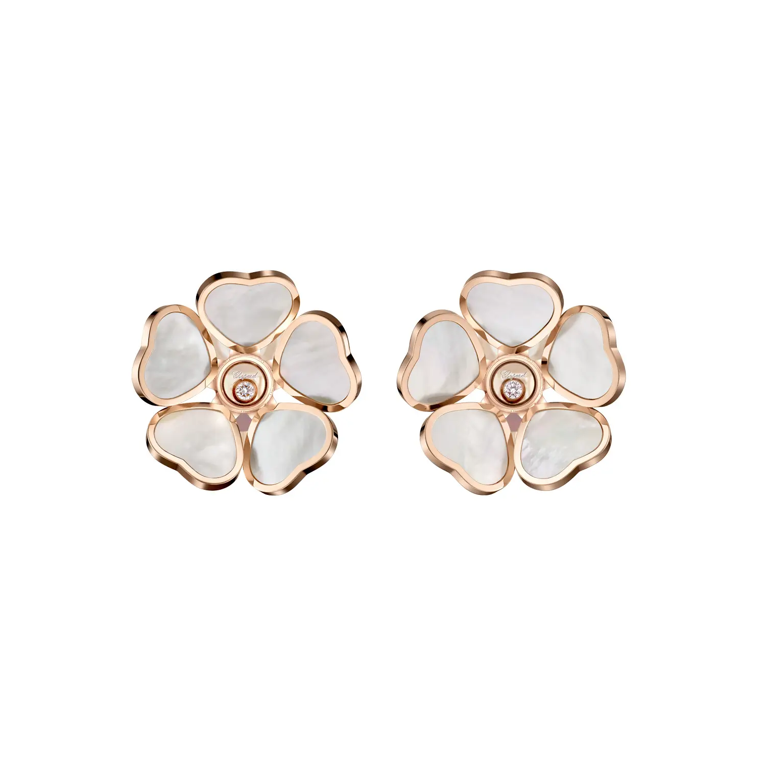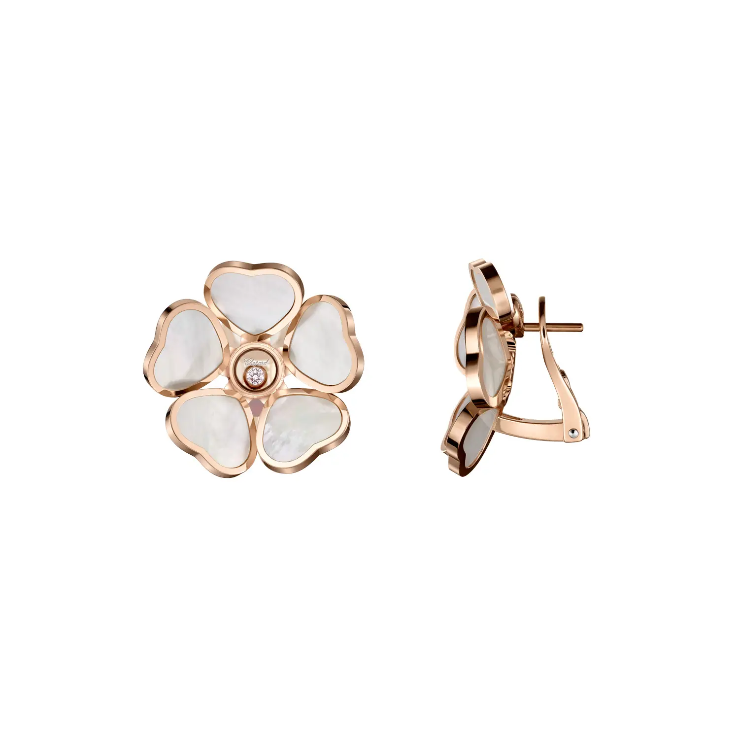 这款 Chopard Happy Hearts Flowers 84A085-5301 耳饰展现了该系列标志性的女性柔美与愉悦气息。采用 18K 道德玫瑰金 制作,饰以 白色珍珠母贝 与 明亮式切割钻石,钻石在由五片心形花瓣组成的花朵中央闪耀。