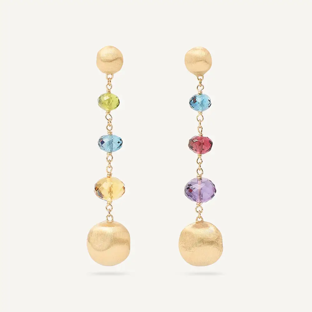 Marco Bicego Africa OB1625 MIX02 Y 耳环展现出色彩、精致设计与金工艺术的和谐融合。采用 18K 黄色黄金 (750/1000) 制作,搭配 哑光 (matte) 表面处理,使彩色宝石更显生动。耳环以 针扣 (puzeta) 固定,佩戴舒适且简洁。
