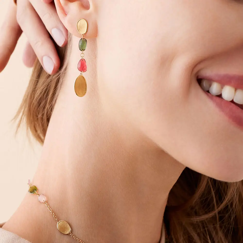 Marco Bicego Lunaria Color OB1899 TM Y 耳环在优雅的黄金设计中注入一抹俏皮色彩。它们采用 18K 黄色黄金 (750/1000) 制造,饰以 抛光 & 哑光 相结合的表面处理,在亮度与柔和感之间形成微妙张力。耳环的固定方式为 针扣 (puzeta),佩戴稳固、低调。
