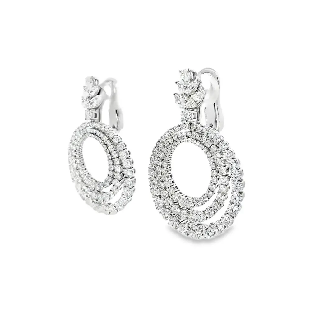 耳环尺寸为 28.25 × 24.30 mm,镶嵌 190 颗天然圆形切割钻石(总重 6.82 克拉,尺寸 1.10–3.70 mm,颜色 E,净度 VVS)以及 10 颗马眼形切割钻石(总重 1.17 克拉,颜色 F,净度 VVS)。光影交织,构筑出绝妙平衡与耀眼光辉。