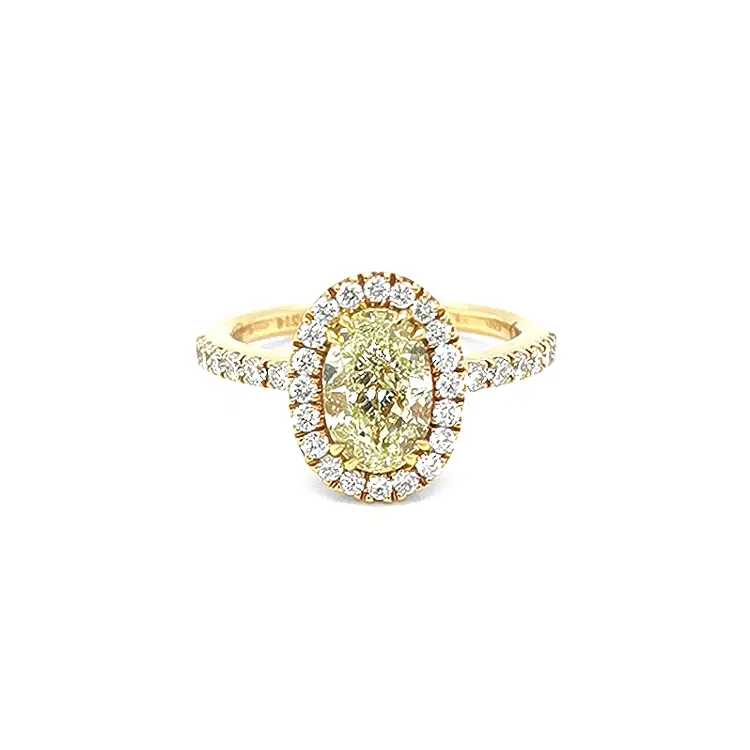 中心主石为天然钻石 2.02 克拉(1 颗),椭圆形切工(8.90 × 6.60 mm),Fancy Yellow(黄彩)。光环与戒臂镶嵌天然钻石 0.52 克拉(32 颗),圆形切工(Ø 1.65 mm),白色,净度 VS1,颜色 I,带来火彩与对比。精密镶嵌既凸显主石的饱满黄调,也强化群镶的闪耀——成就一枚永不过时、醒目而浪漫的订婚戒,令爱的告白难以忘怀。