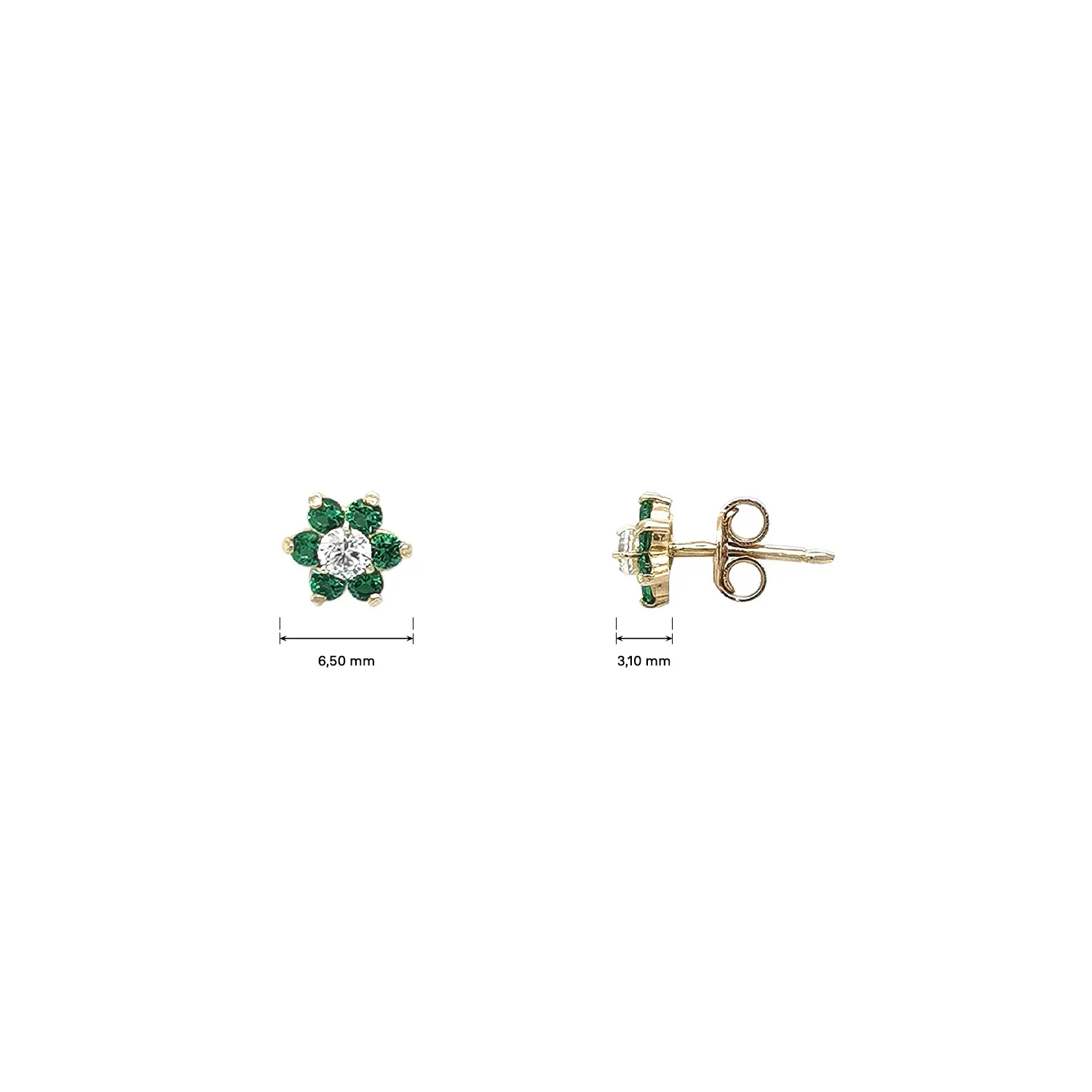 这款金色小花耳钉以绿色与透明宝石的组合展现清新优雅的魅力。中央的透明宝石被深绿色宝石环绕,形成花瓣,营造出细腻而亮眼的对比。