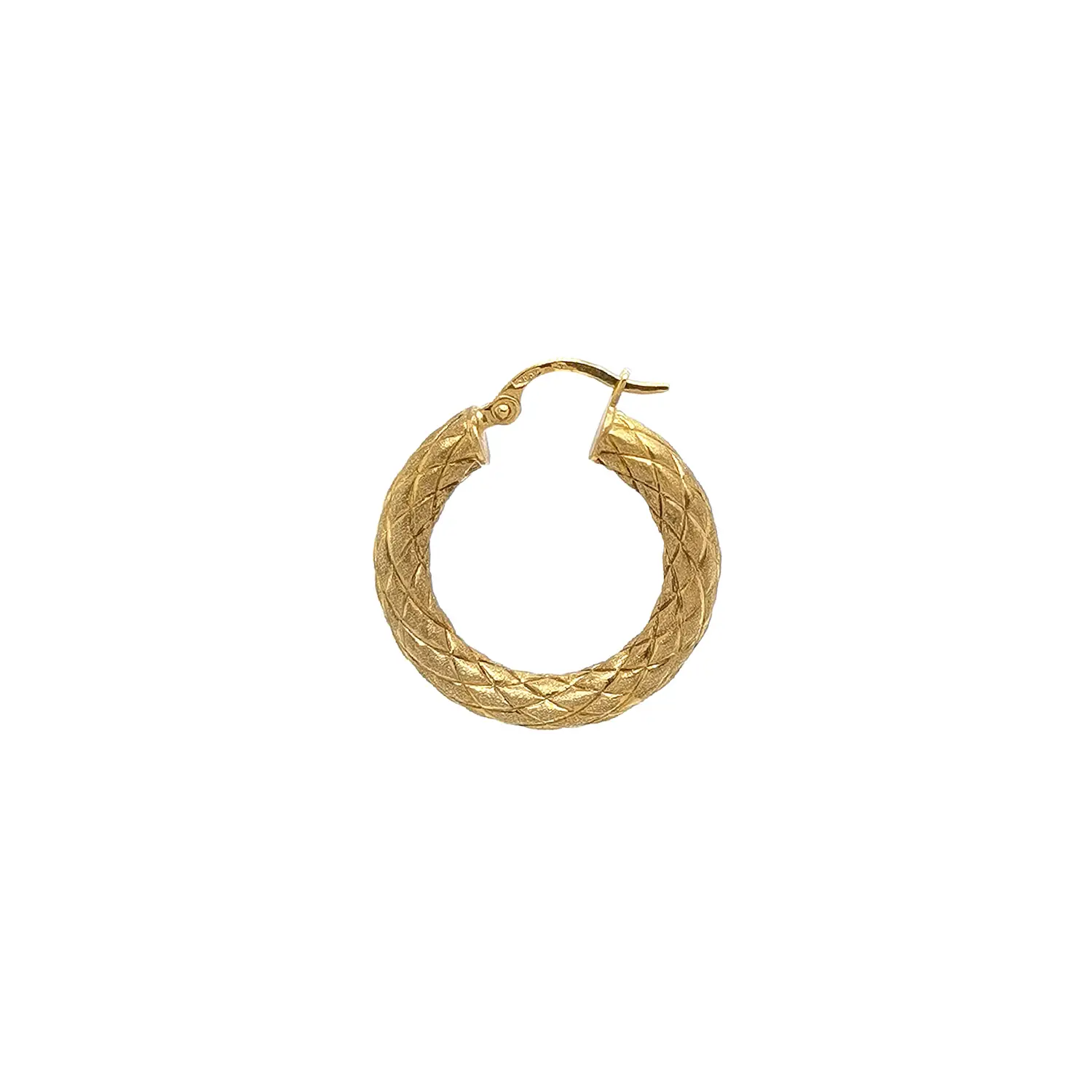 这款14K黄金圆环耳环以独特的编织纹理而脱颖而出。哑光立体表面呈现丰富的细节层次,在柔和光线下散发优雅光泽,赋予耳环奢华且略带复古的气质。略厚的弧面造型显得精致而独特,非常适合喜爱有质感、工艺感设计的女性。