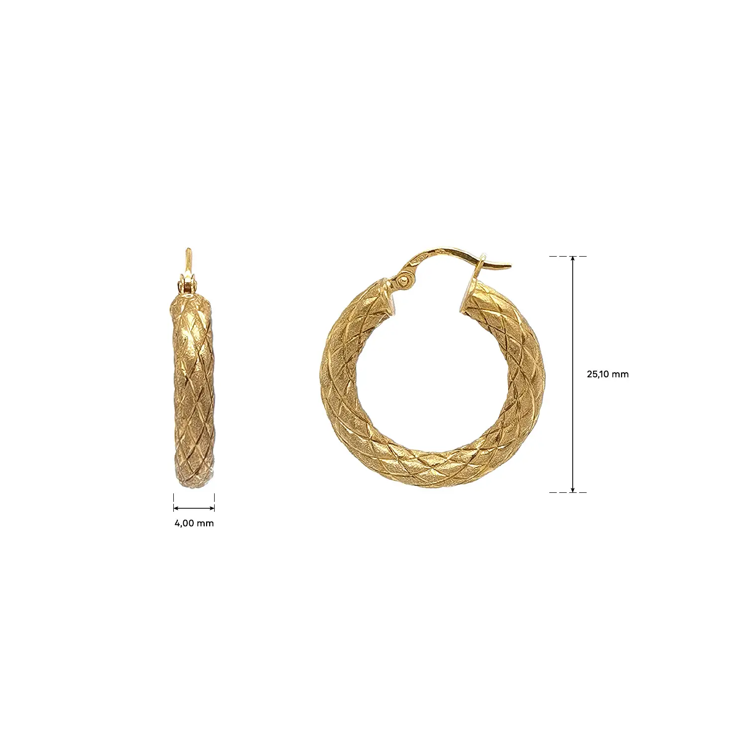 直径 25.10 毫米 的尺寸恰到好处——足够醒目,同时佩戴舒适,适合整日配戴。稳固的扣式设计确保日常佩戴的安全性。是喜爱黄金圆环耳环、追求纹理感与永不过时优雅风格女性的理想之选。