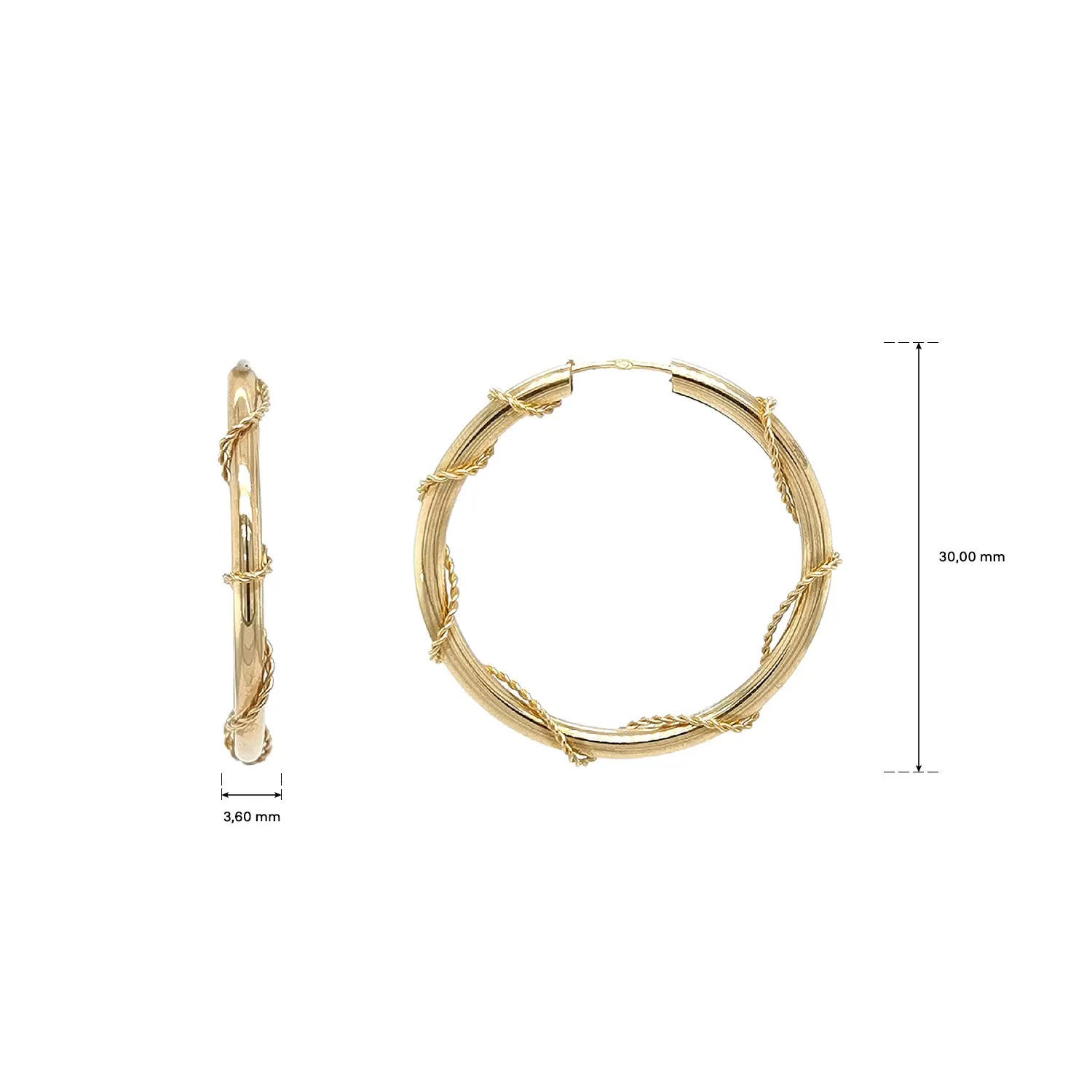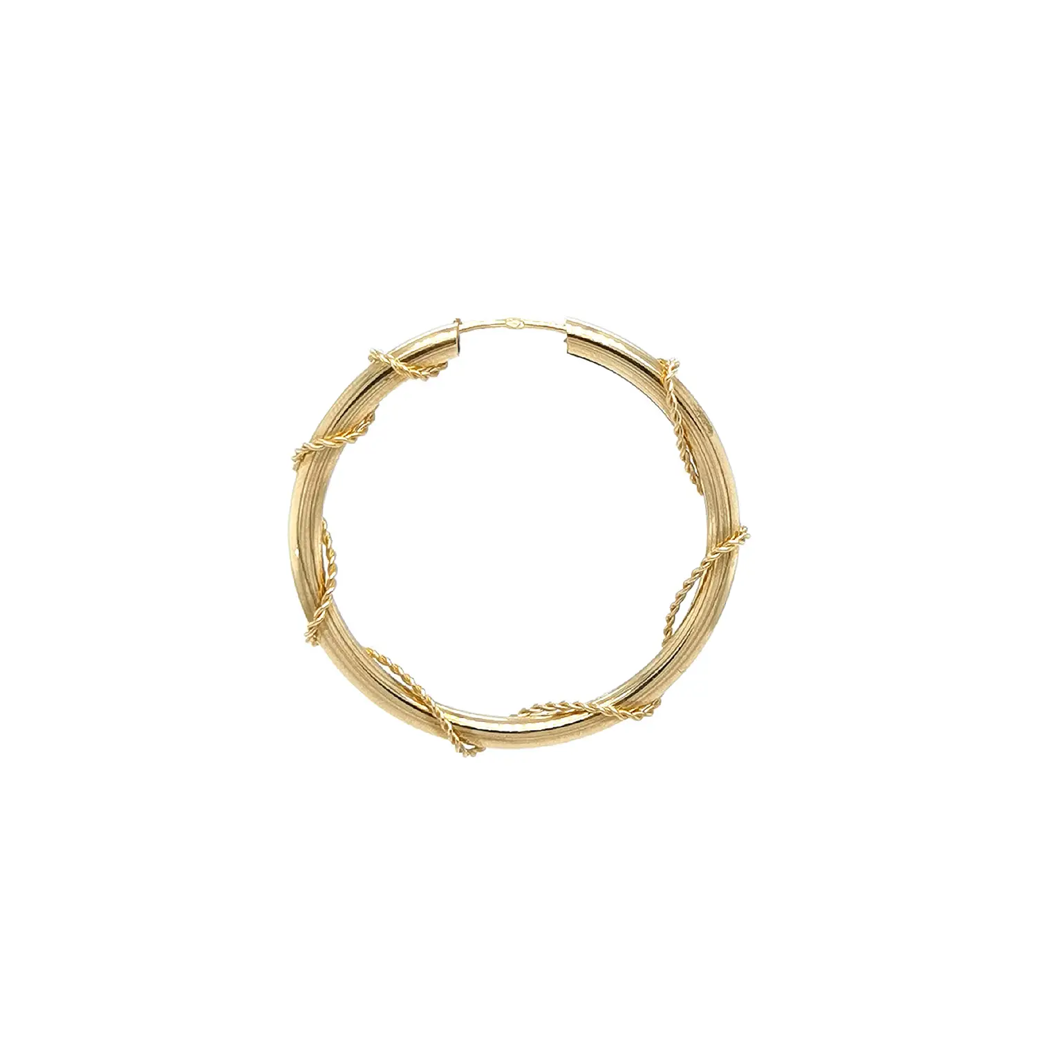 这款14K黄金圆环耳环以独特的扭纹金丝装饰而脱颖而出,精细的金丝以螺旋方式环绕整个耳环,展现优雅而精致的工艺。光滑高亮的抛光表面与细腻的纹理形成鲜明对比,使耳环呈现出奢华而富有层次的视觉效果。