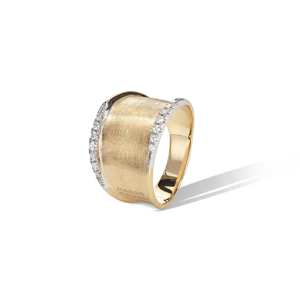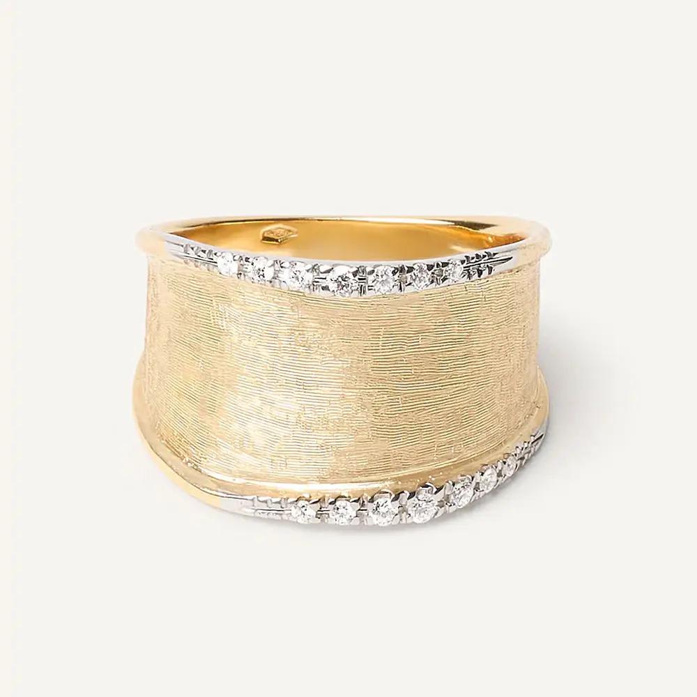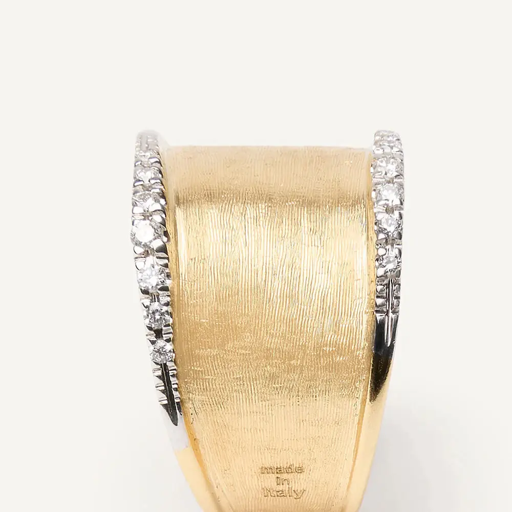 这款 Marco Bicego Lunaria AB550 B YW Q6 戒指融合了细腻魅力与耀眼张力。它由 18K 组合金 (750/1000) 制成,饰以 Lunaria 系列的手工雕刻图案,为戒指增添了精致纹理与独特个性。