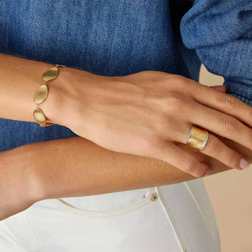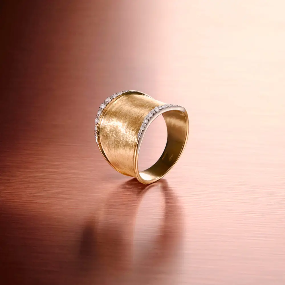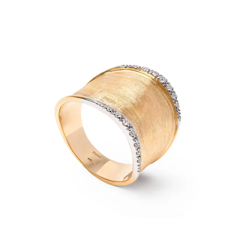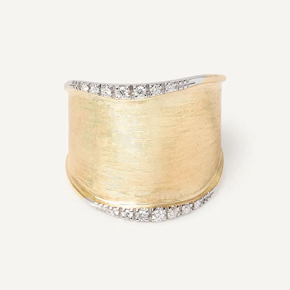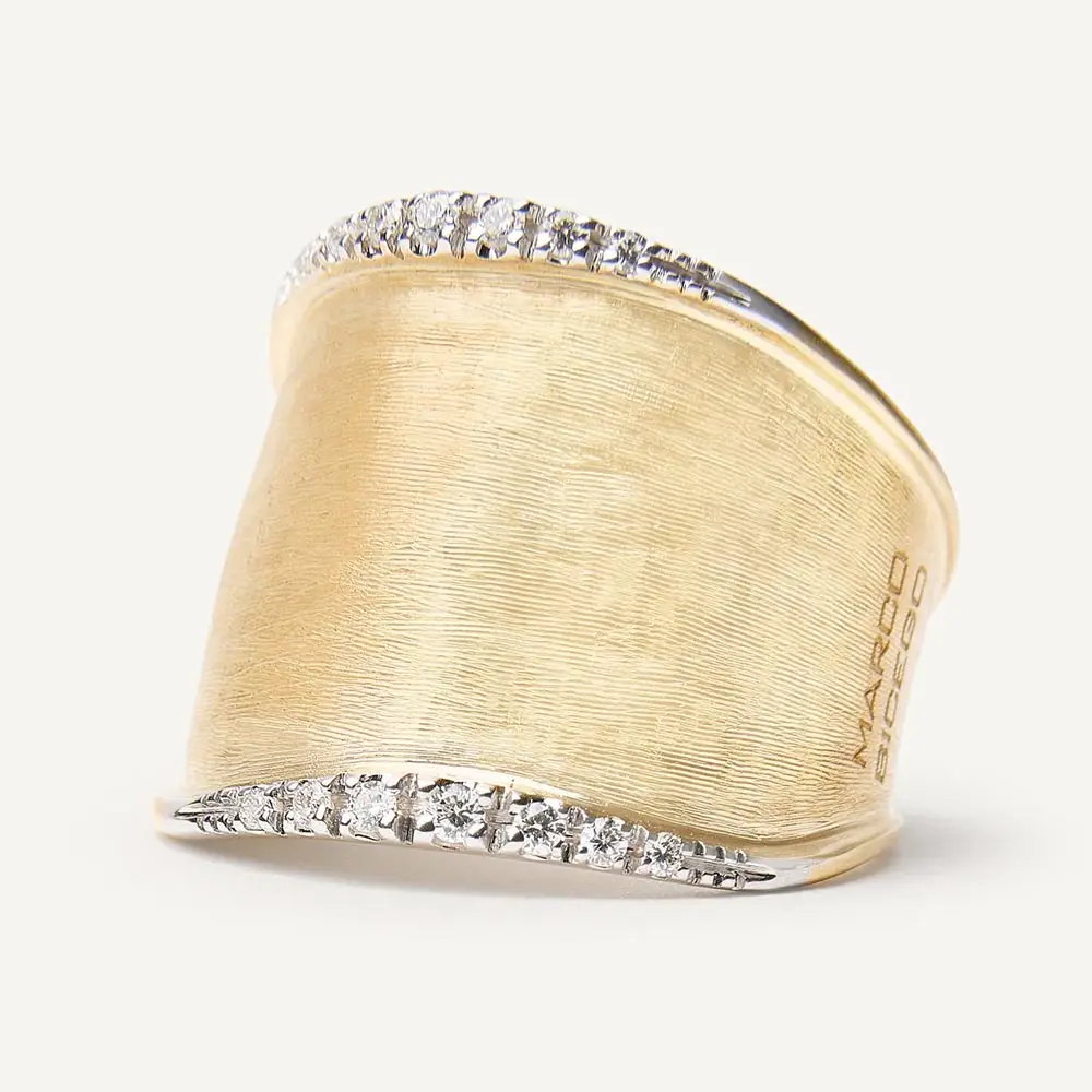 这款 Marco Bicego Lunaria AB551 B YW Q6 戒指呈现了精致设计与精湛工艺的完美融合。采用 组合金 18K (750/1000) 制作,戒面融合 抛光与哑光工艺,带来优雅的层次与光影对比。