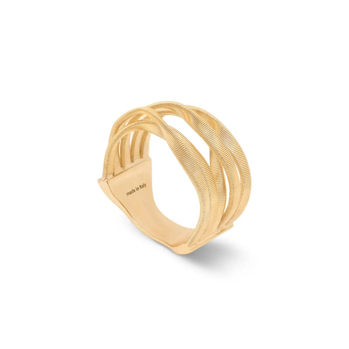这款 Marco Bicego Marrakech AG365 Y 01 戒指呈现结构感与精致工艺的融合。采用 18K 黄色黄金 (750/1000) 制作,戒面交替使用 抛光与哑光工艺,在光影中展现层次与质感。
