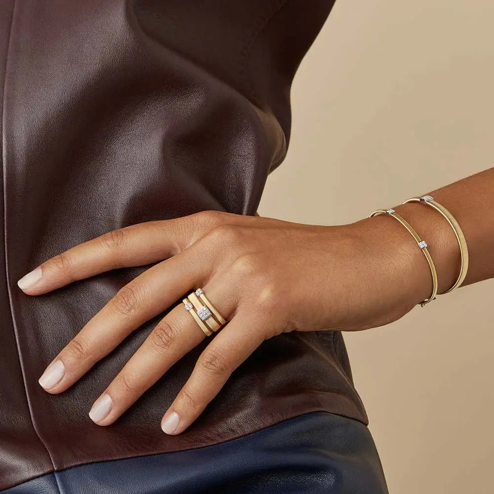 Masai 系列 的灵感源自 马赛部落的传统首饰,这些首饰以其大胆和象征意义而闻名。Marco Bicego 将这些元素重新演绎为现代设计,在其中融合了简洁线条、优雅与力量。Masai 是极简奢华的化身,既展现出纤细之美,又流露出宏伟气质。