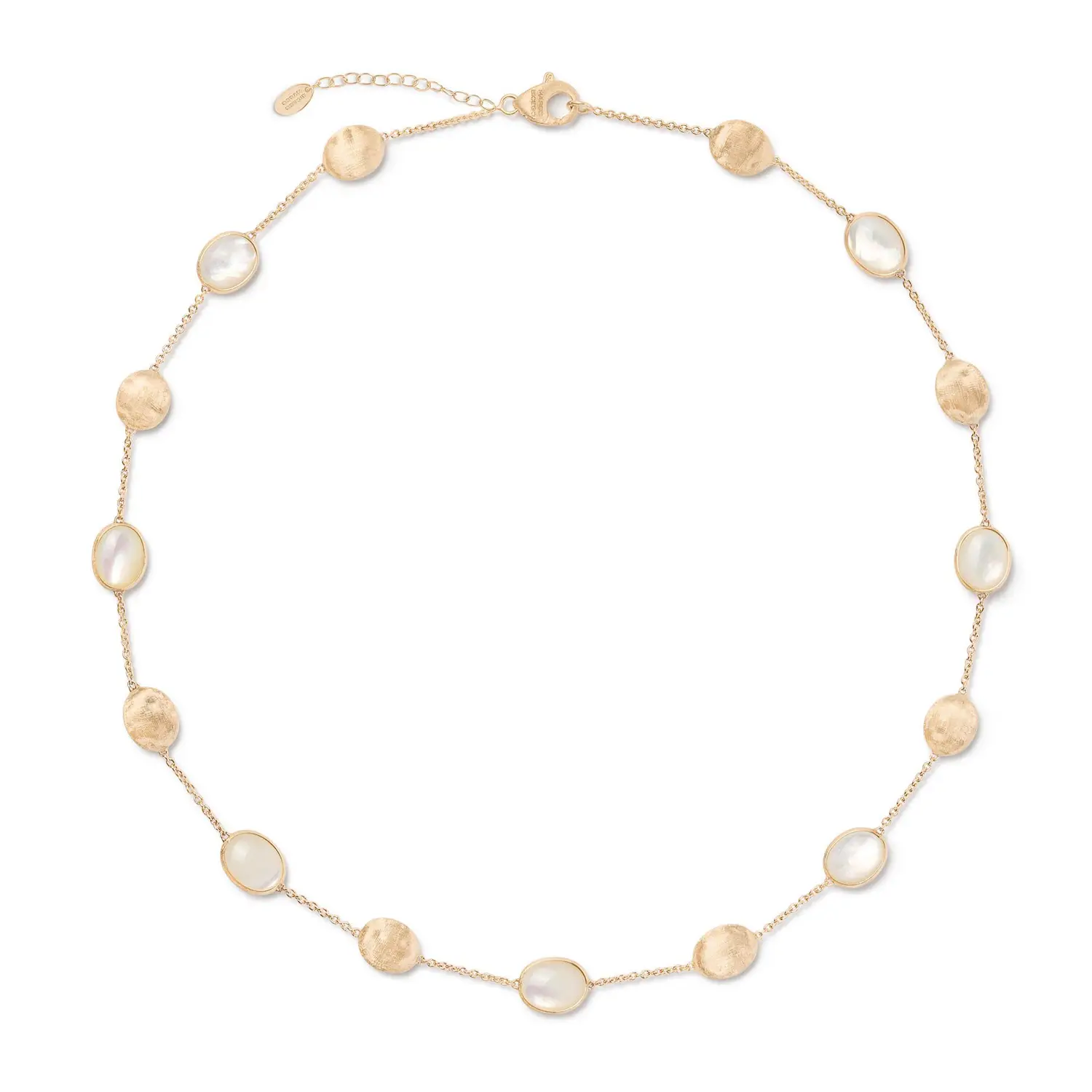 项链镶有 7 颗天然珍珠母贝,呈 椭圆形,并采用 Rose cut(玫瑰切割) 打磨,使其白色光泽更加柔美细腻。金色的温暖与母贝的清透光感相互映衬,展现自然且奢华的气质。