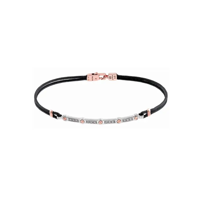 Zancan 男士钻石手链将现代双色(bicolor)美学与意式精工相结合。采用 18K 金(750/1000)打造,白金与玫瑰金双色并配抛光处理。柔性绳式结构贴合手腕,无论休闲或正装都显得优雅得体——一款日常百搭的配饰。