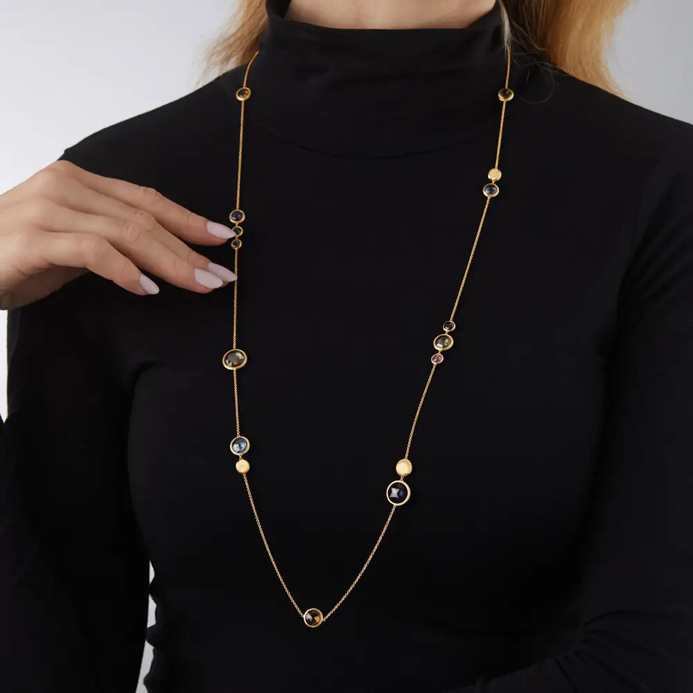 项链镶嵌 14 颗天然多彩半宝石,每颗为 圆形切割 (Round),由工匠手工抛光打磨,展现晶莹剔透的光芒。色彩组合丰富多样——粉红、绿色、蓝色、紫色与金色交织成一幅光影画卷。