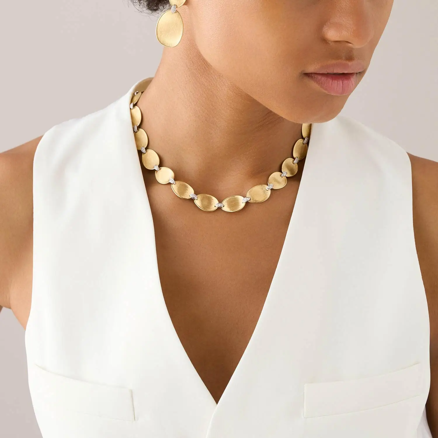项链设计灵感源自自然形态,并融合品牌标志性的 手工雕刻工艺,呈现丝绸般的哑光质感,使每一件作品都独一无二。有机线条与璀璨钻石的结合 展现出永恒优雅的风格,既适合日常佩戴,也适用于重要场合。