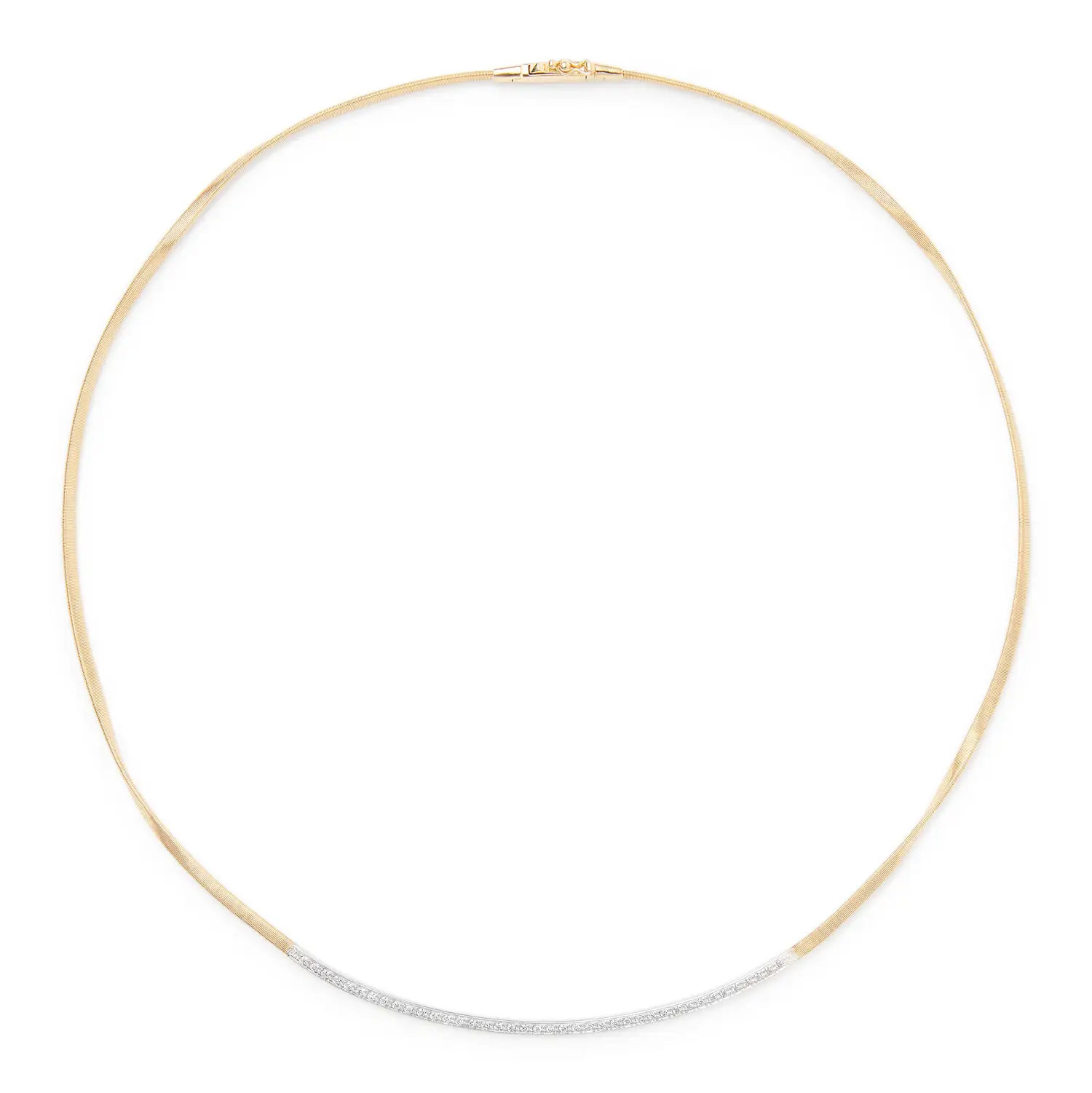 这款来自 Marco Bicego Marrakech New 系列的项链采用 18 kt 组合金 (750/1000) 制作,并以 哑光工艺 完成,突显系列标志性的金线编织质感。链长 42 cm,佩戴于颈间优雅稳重。