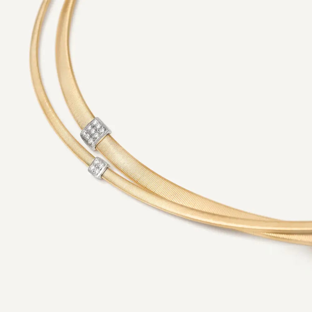 这款来自 Marco Bicego Masai 系列的项链展现了以非洲纹饰为灵感的现代极简主义美学。采用 18 kt 组合金 (750/1000) 制作,并结合 亮面与哑光工艺,呈现该系列独特的手工质感。42 cm 的链长佩戴在颈间格外优雅。