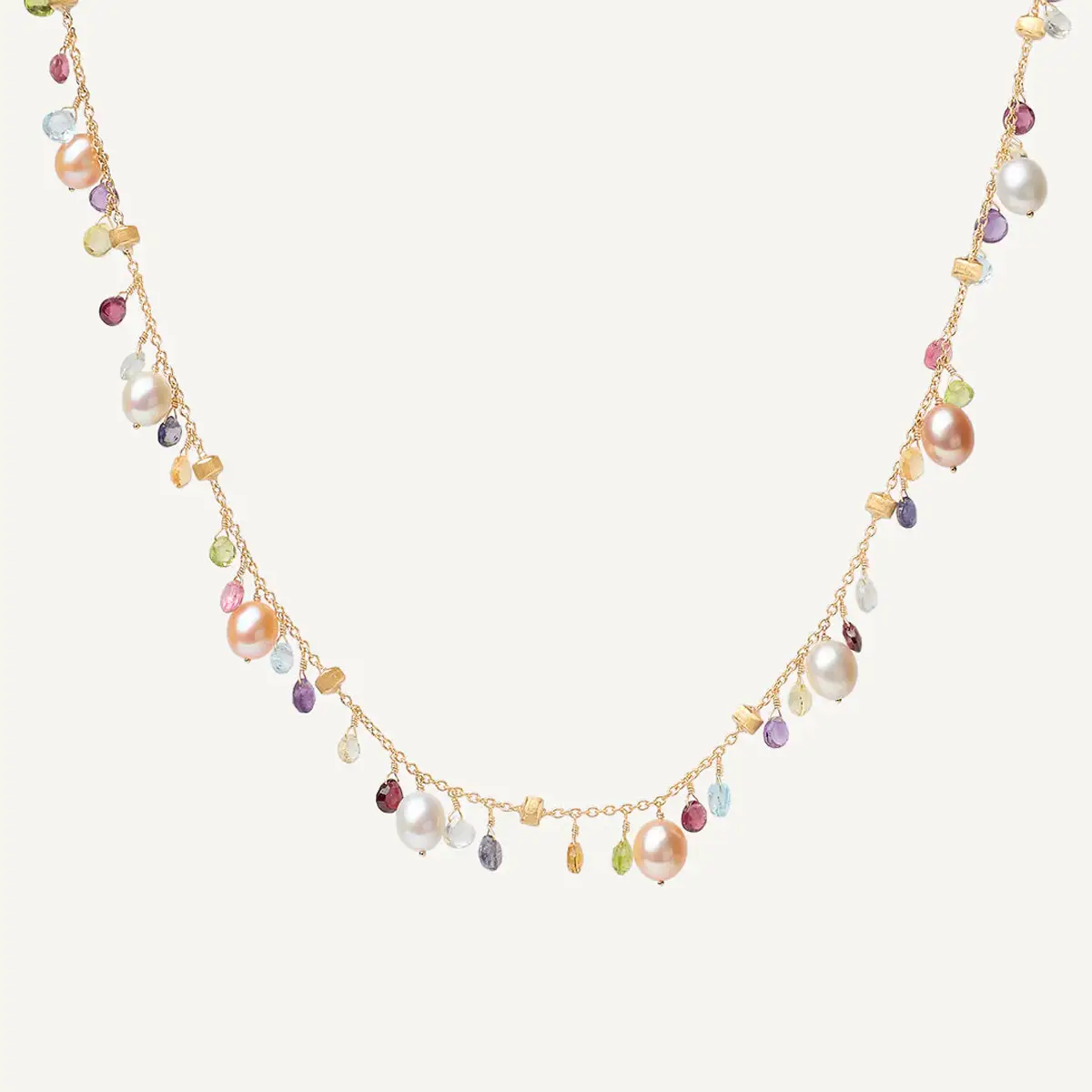型号 CB2584-E MIX114 Y 02 长度约 42 厘米(16.5 英寸),可延长至 18 英寸,佩戴时优雅贴合颈部。结合 18K 黄金、天然宝石、淡水珍珠以及 Marco Bicego 精湛的意大利工艺,使其成为理想的 高端礼品。