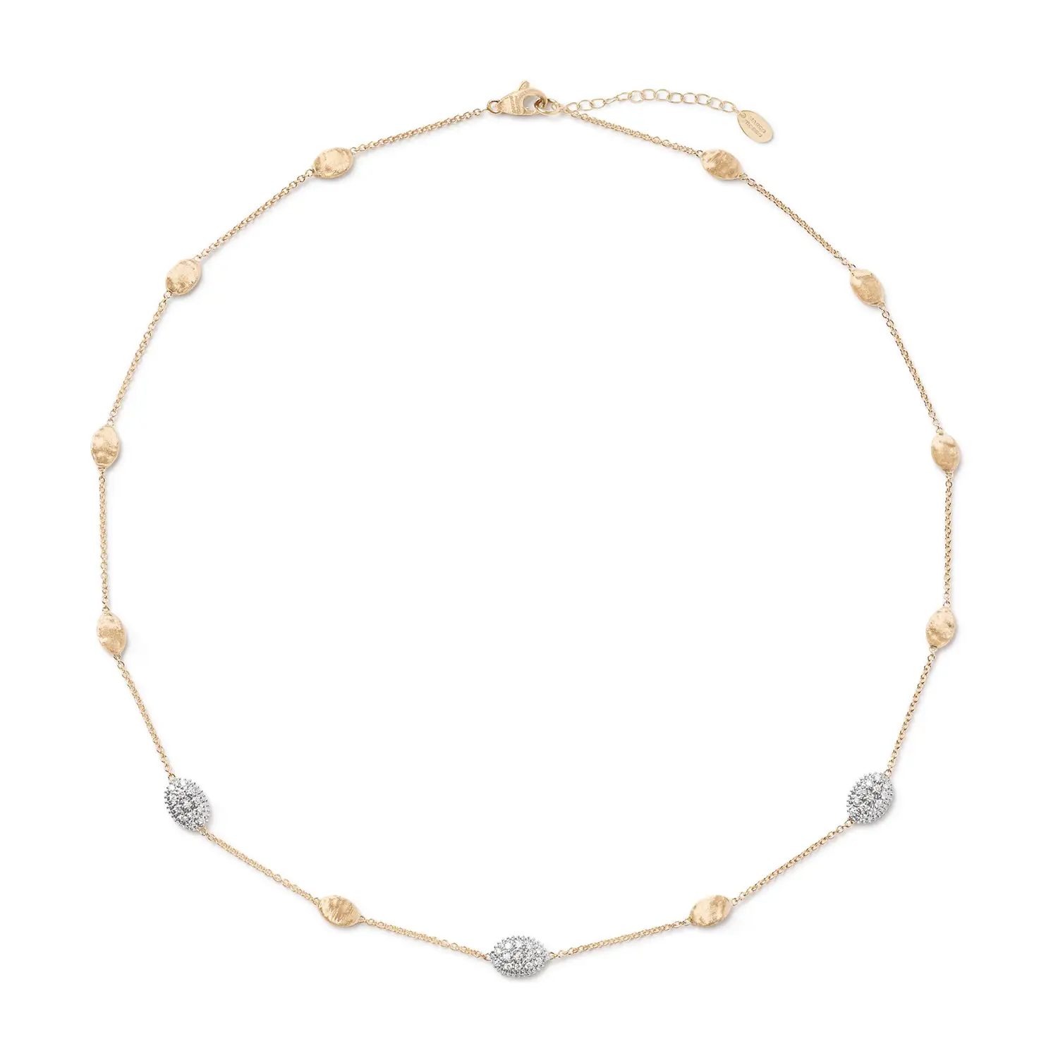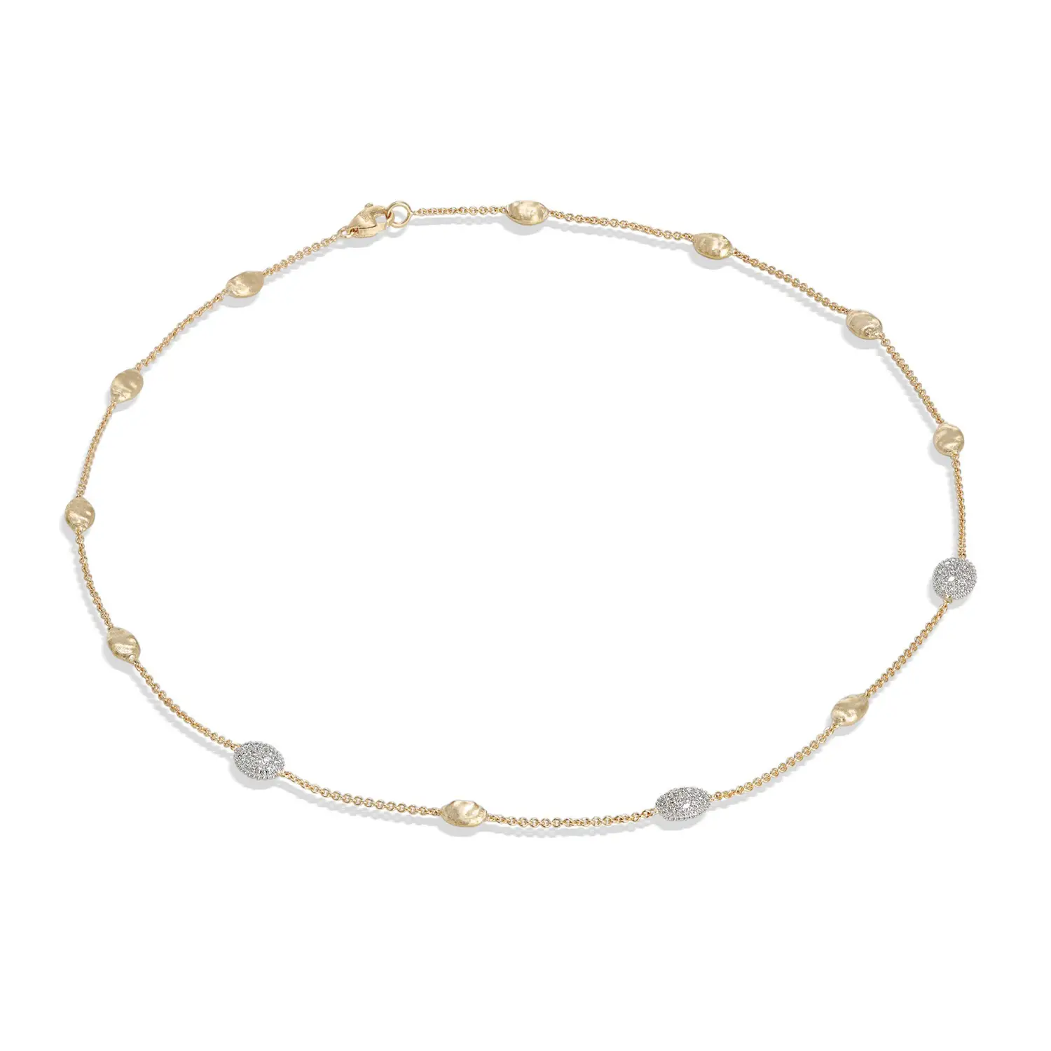 这款 Marco Bicego Siviglia 系列项链采用 18 kt 黄金 (750/1000) 制作,结合 亮面与哑光工艺,呈现优雅且富有手工质感的风格。42 cm 的长度恰到好处,佩戴在颈间显得典雅而柔美。