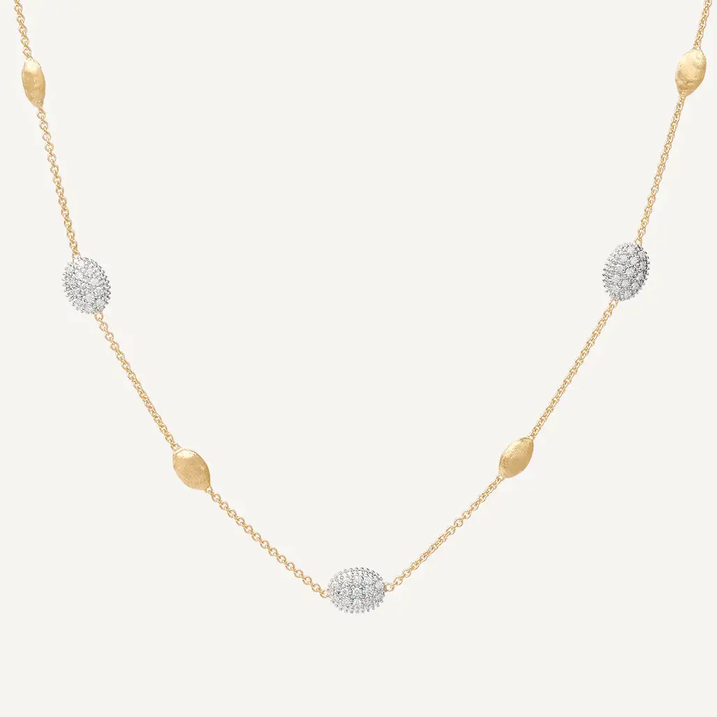 每件作品均由 Marco Bicego 工坊手工打造,并饰以 bulino 手工雕刻,赋予其丝绒般的哑光质感。精致的金片通过轻盈的链条相连,能自然随身体动作摆动。Siviglia 系列包括 项链、手链、耳环和戒指,常点缀钻石以提升精致感。