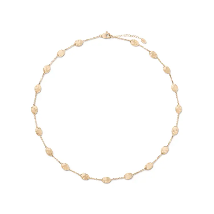 每件作品均由 Marco Bicego 工坊手工打造,并饰以 bulino 手工雕刻,赋予其丝绒般的哑光质感。精致的金片通过轻盈的链条相连,能自然随身体动作摆动。Siviglia 系列包括 项链、手链、耳环和戒指,常点缀钻石以提升精致感。