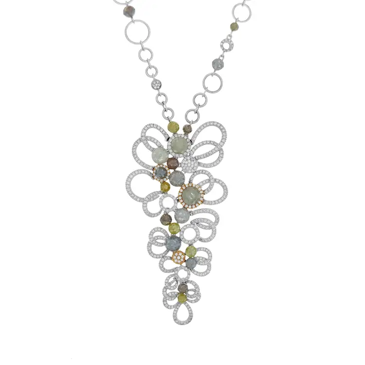 这款来自 Beny Jewellery 的 白金彩色宝石与钻石项链 展现了奢华与匠心工艺的完美结合。采用 18 kt (750/1000) 白金 精制,镜面抛光,结构层次丰富,色彩柔和交织,展现出独特的艺术魅力与女性优雅。