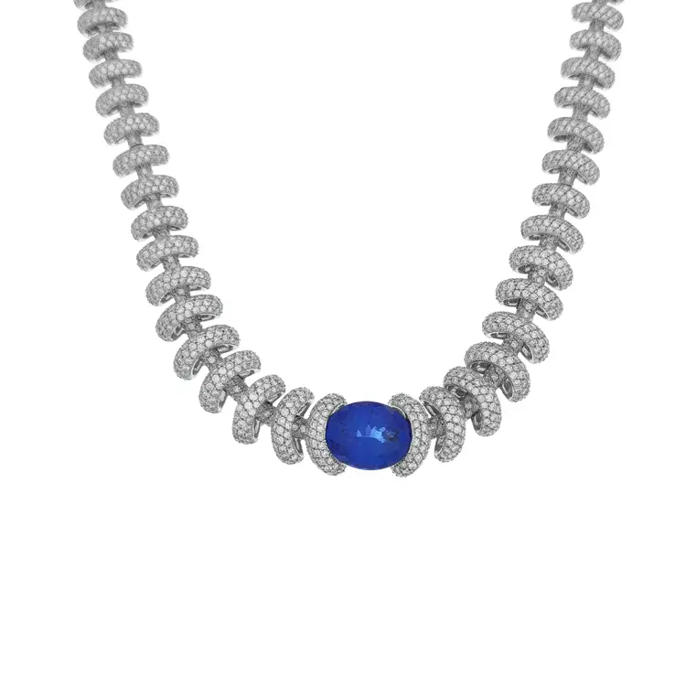 项链中央镶嵌一颗 天然坦桑石,总重 7.63 克拉,椭圆形切割(13.50 × 10.70 毫米),深邃的蓝色象征宁静与优雅。周围环绕 1,590 颗天然白钻,总重 11.78 克拉(圆形切割、1.20 毫米、G 色 / VS 净度),璀璨夺目的光辉衬托出坦桑石的迷人光彩。