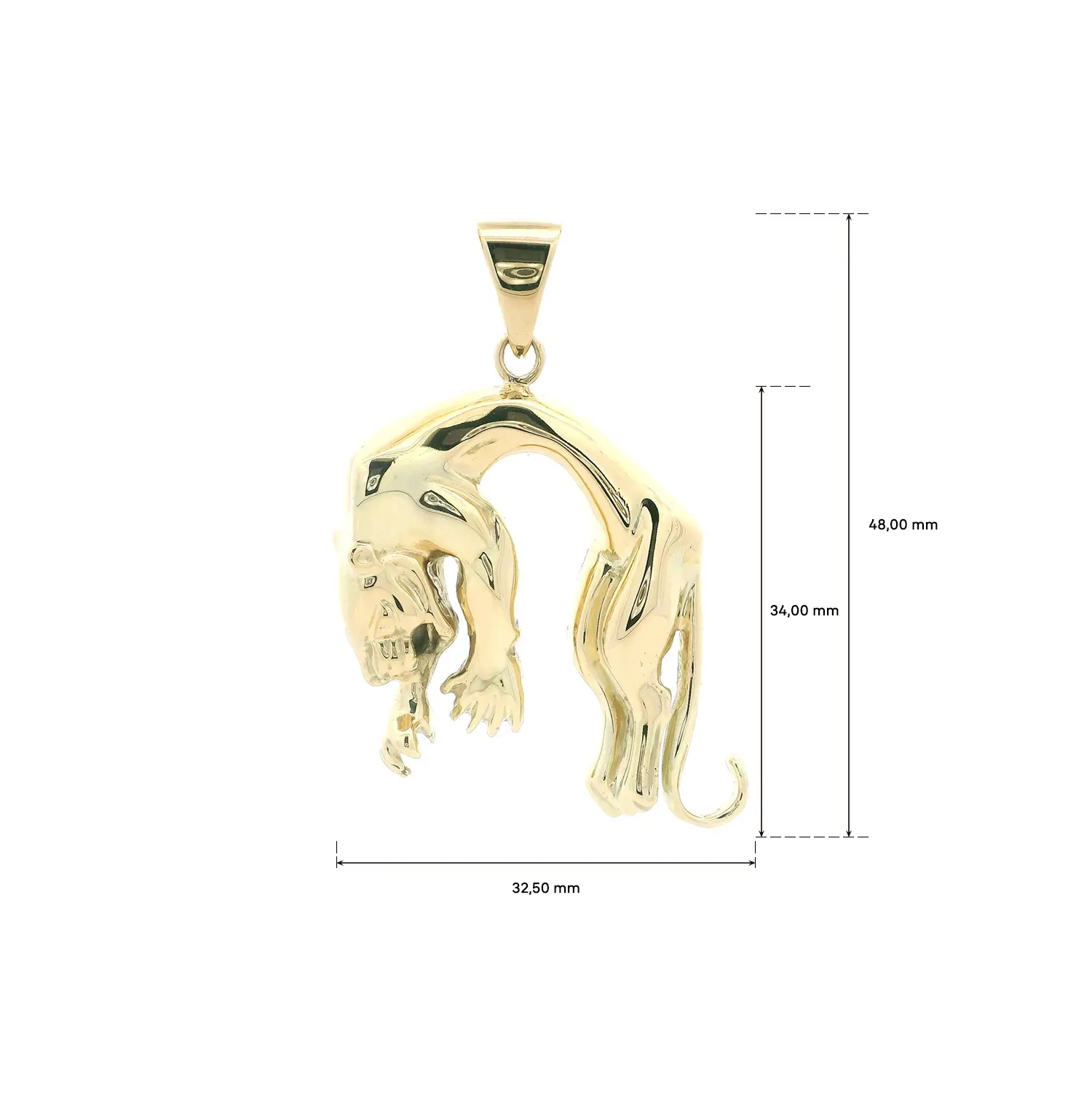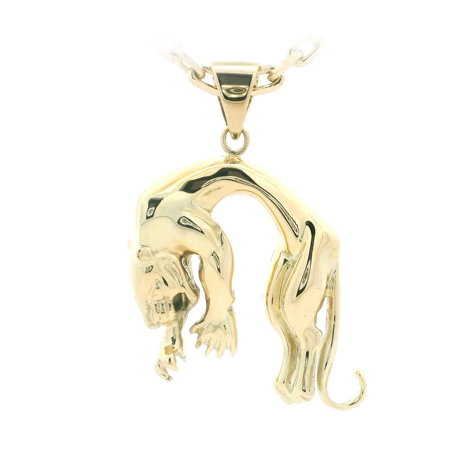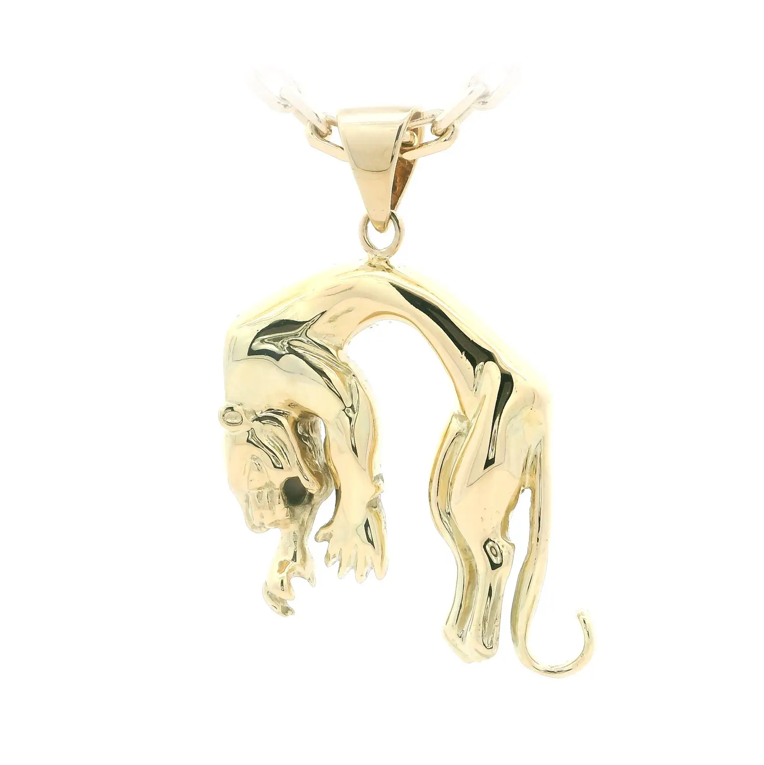 这款金质吊坠以优雅弧形的豹为造型,展现了非凡的珠宝工艺。采用 14K 黄金 制作,镜面般的光泽突显出猎豹动态的线条与力量。精细的手工雕刻强化了豹的肌肉结构,使整体造型更加立体、逼真。