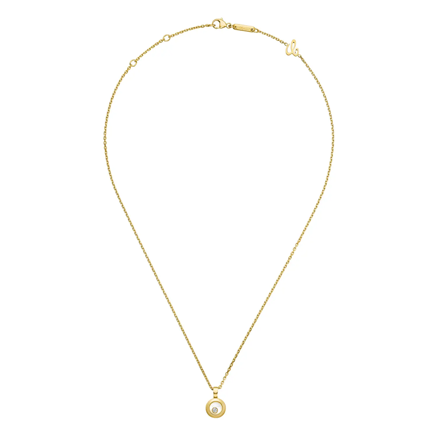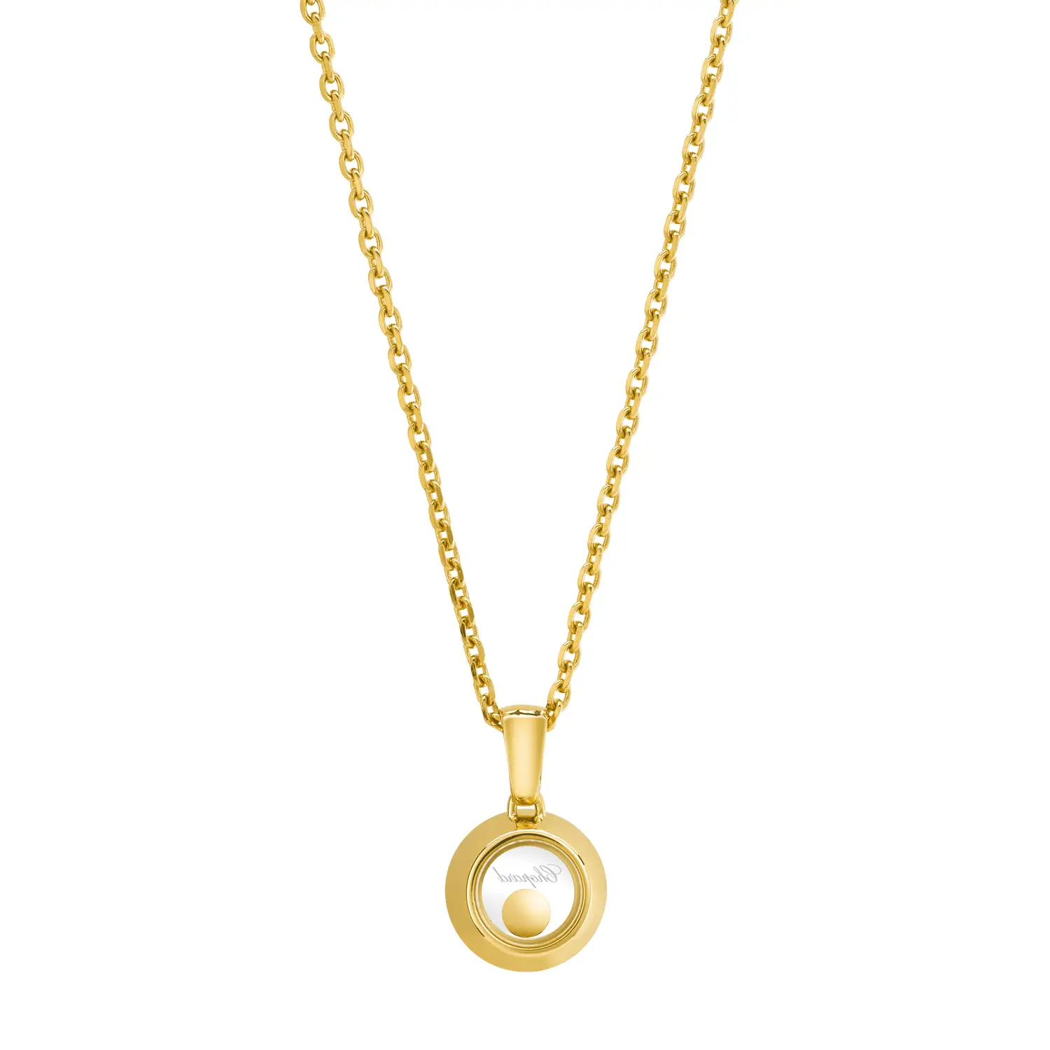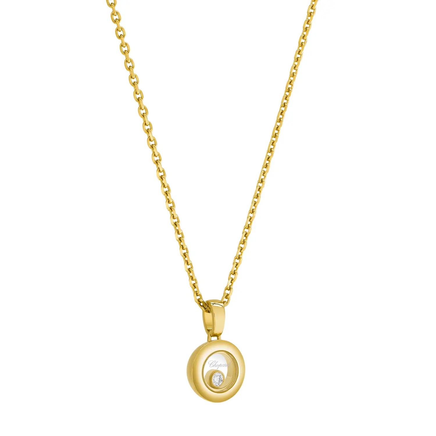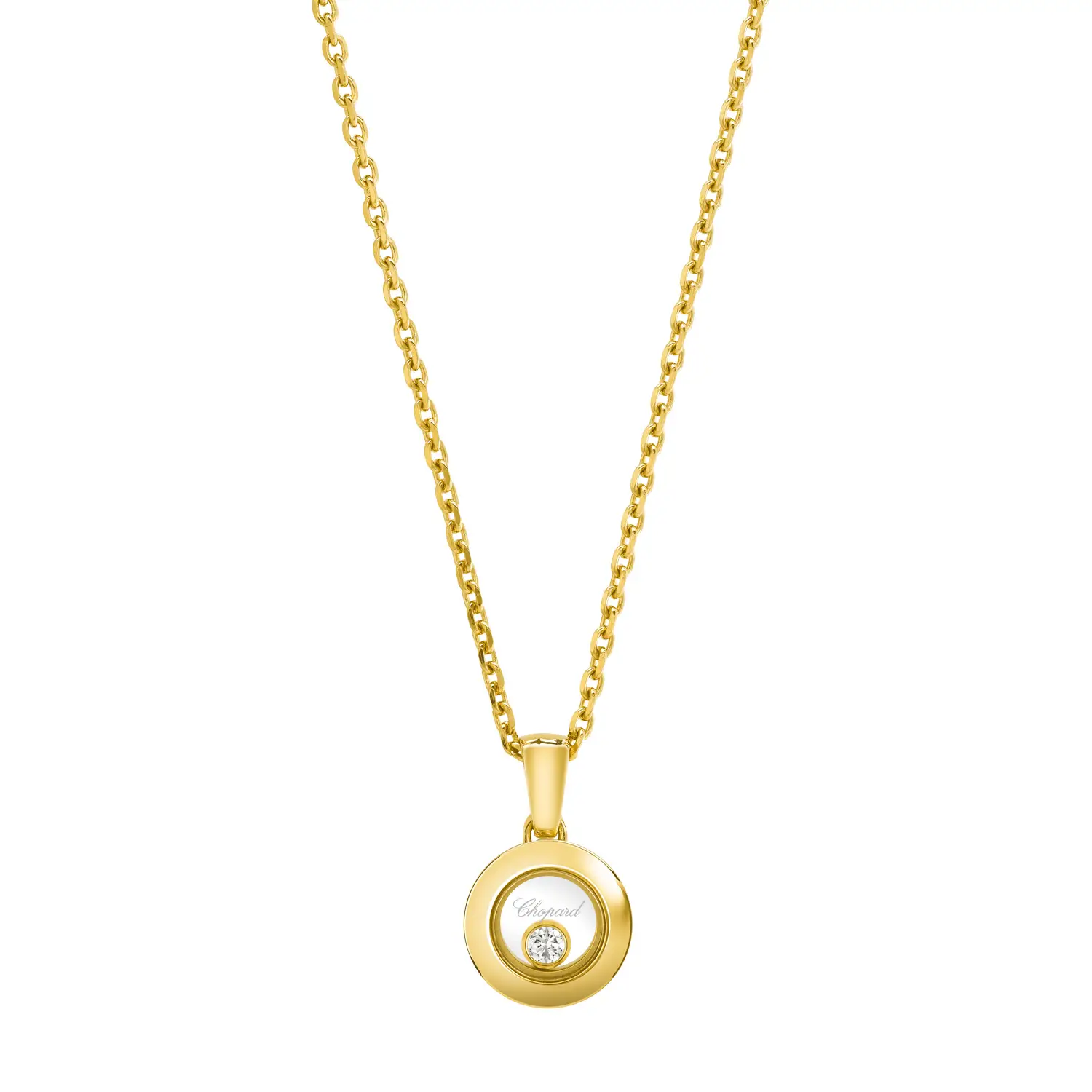 这款来自 Happy Diamonds Icons 系列的吊坠,展现了 喜悦、优雅与灵动之美。采用 18 K 黄金 精制,镶嵌 一颗约 0.05 克拉的自由旋转钻石,钻石被封于两层蓝宝石水晶之间,象征 自由与女性魅力。圆形设计搭配细腻的 Chopard 雕刻,彰显和谐与高雅。