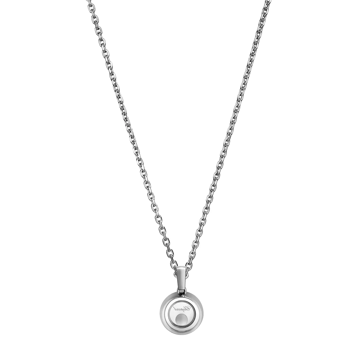 吊坠采用 18K 白金打造,镶嵌 三颗可自由旋动的钻石,并被封装在两层蓝宝石水晶之间。钻石随动作轻盈闪烁,象征幸福与活力,展现了 Chopard 独有的“快乐钻石”理念。抛光的白金表面突显精湛工艺与璀璨光泽。