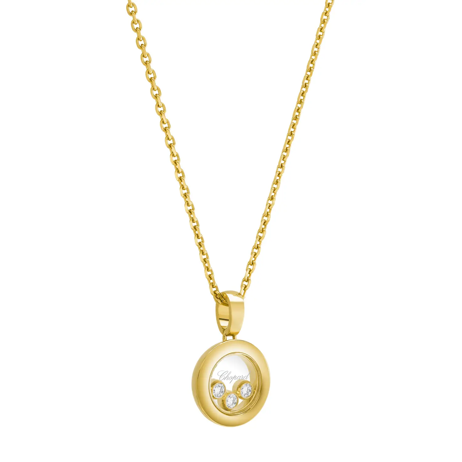萧邦 Chopard Happy Diamonds Icons 79A018-0001 吊坠展现 优雅、光影与动感 的完美融合。采用 18K 道德黄金 制成,饰以 三颗可自由旋转的钻石,置于两层蓝宝石玻璃之间,每次动作都闪耀光芒。圆润设计展现柔美与永恒之美。