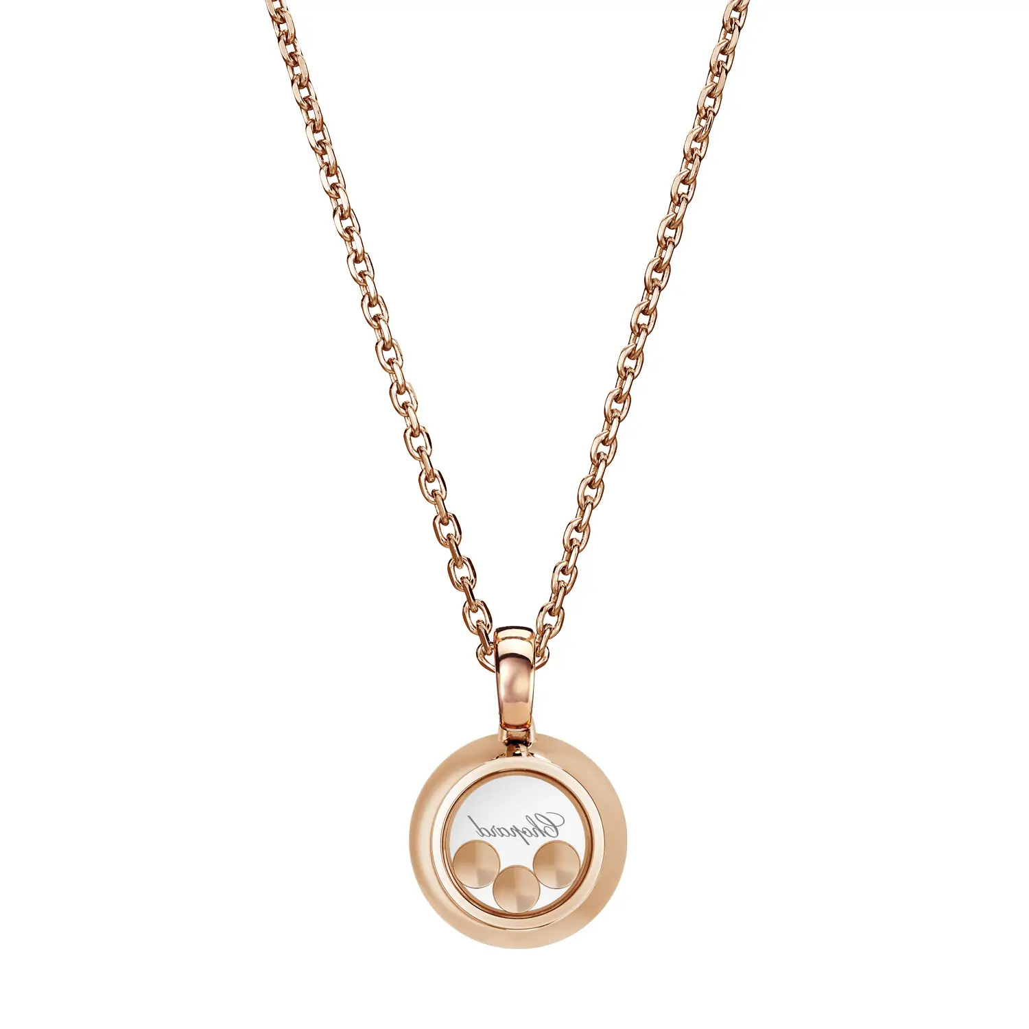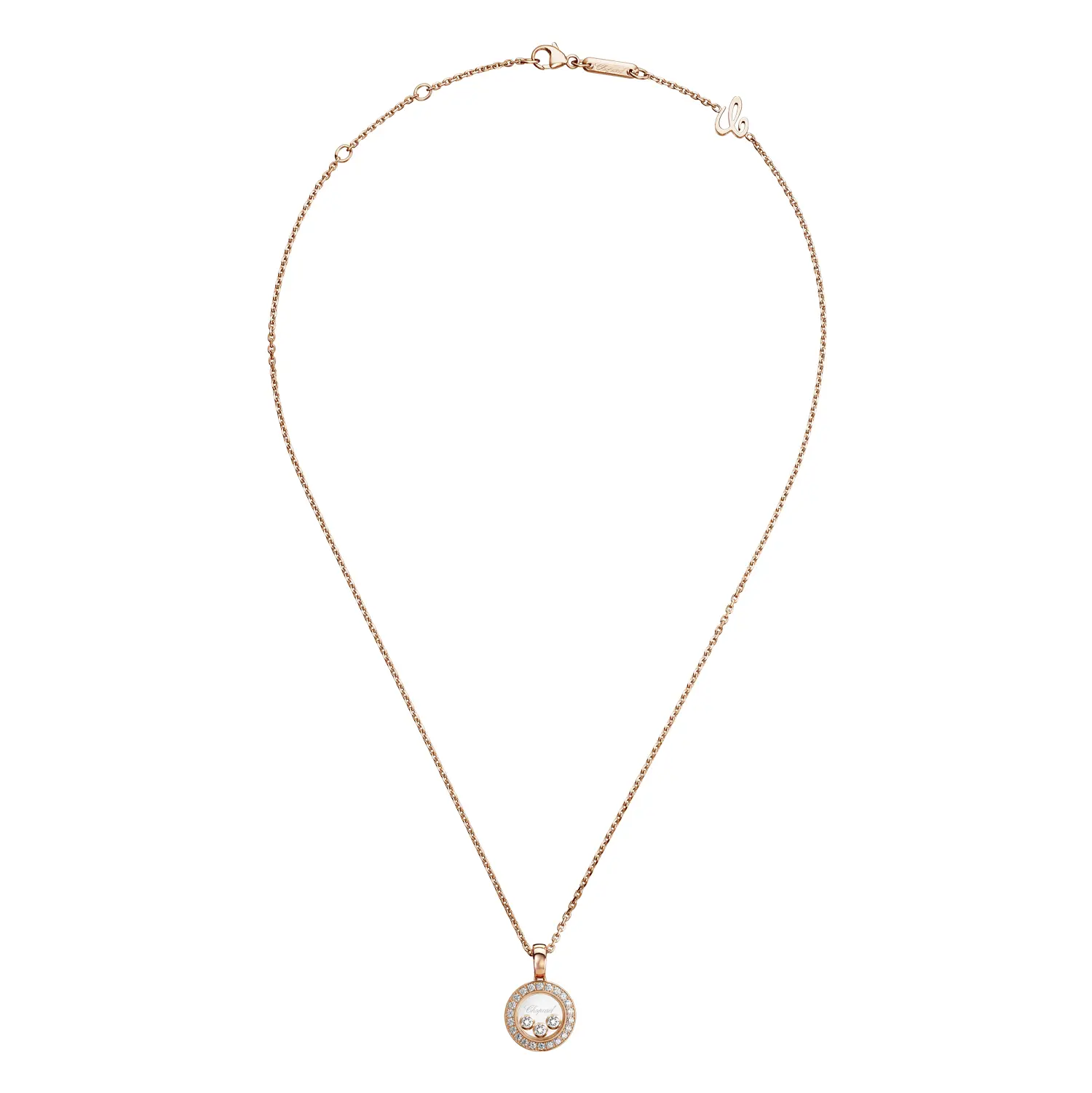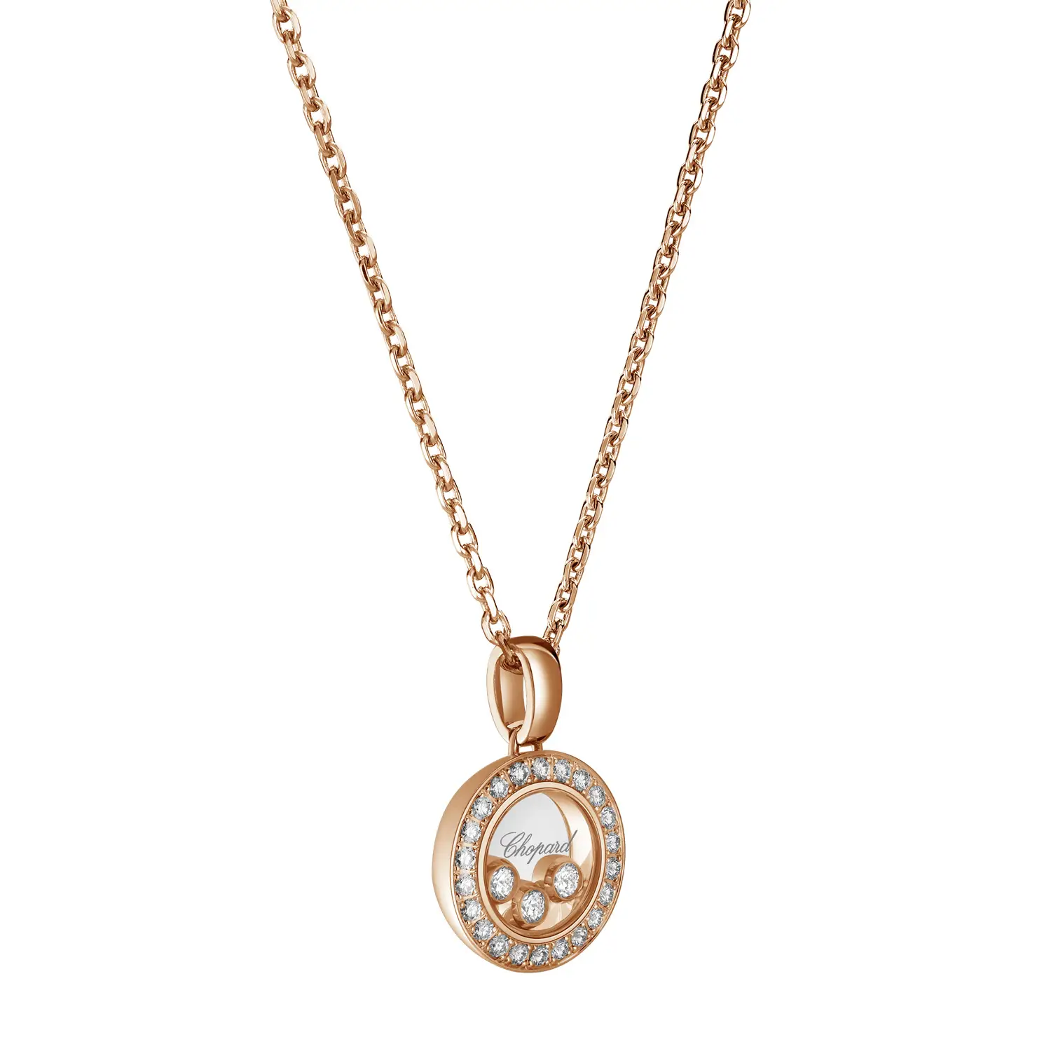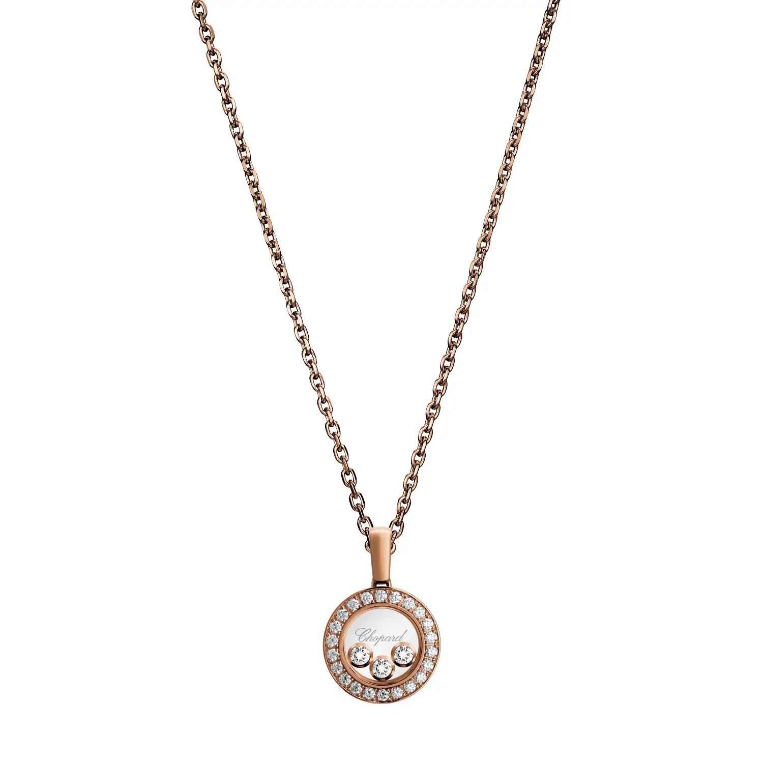 这款来自 Happy Diamonds Icons 系列的吊坠,以 18 K 玫瑰金 精制,镶嵌 约 0.05 克拉的自由旋转钻石,钻石被封于两层蓝宝石水晶之间,随动作闪耀光芒,象征 自由、喜悦与女性优雅。圆形设计刻有 Chopard 标志,展现品牌经典与现代气质。