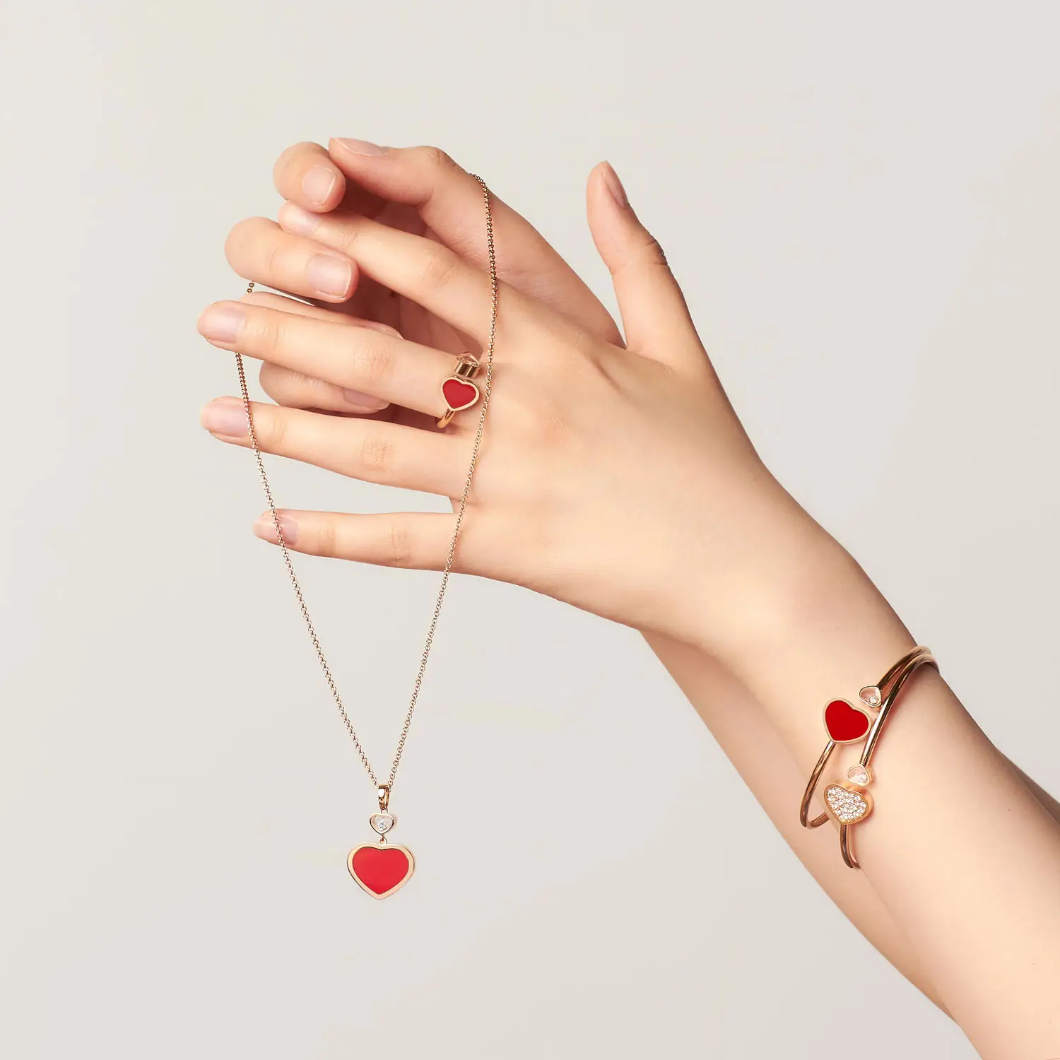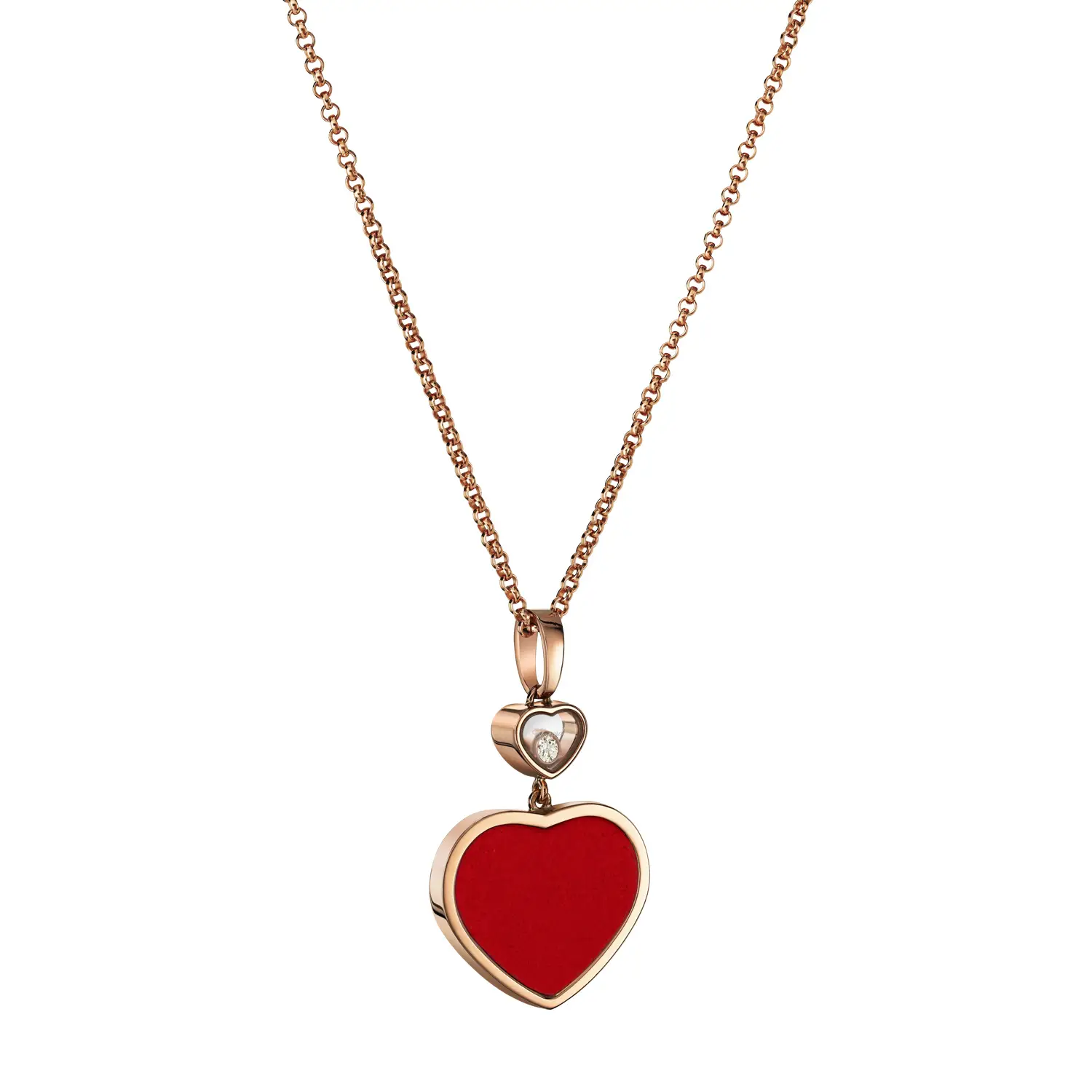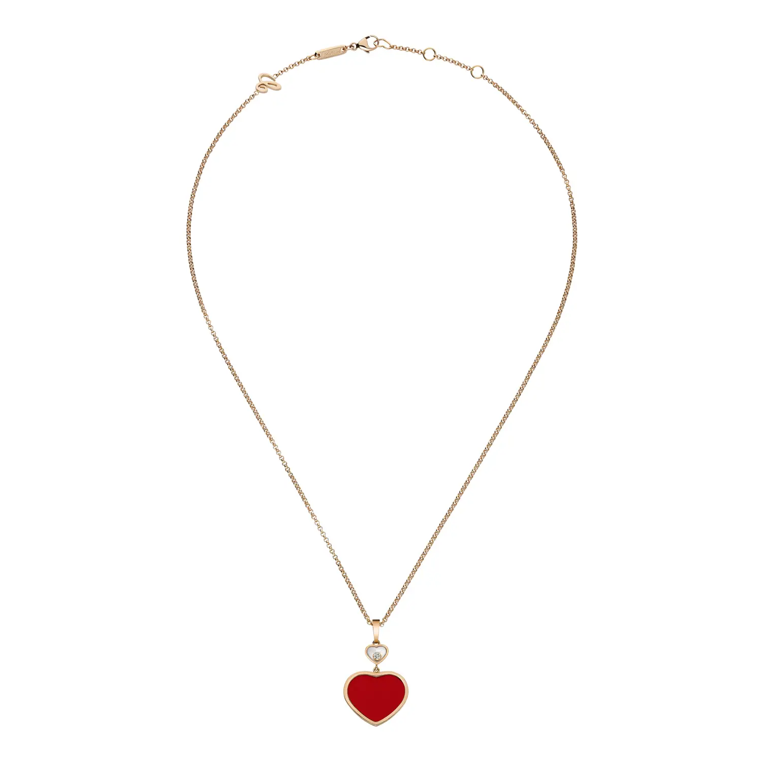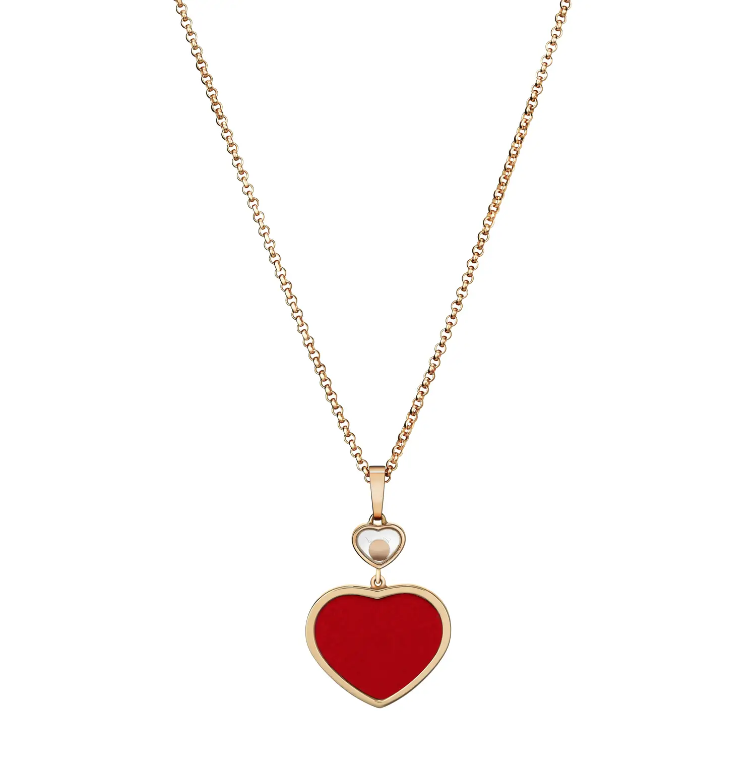 配有 45 厘米精致项链,佩戴轻盈优雅,适合日常与晚宴场合。金色光泽与红玉髓的热情色调相得益彰,象征 女性魅力、喜悦与生命能量,展现 Chopard Happy Hearts 系列的核心精神。