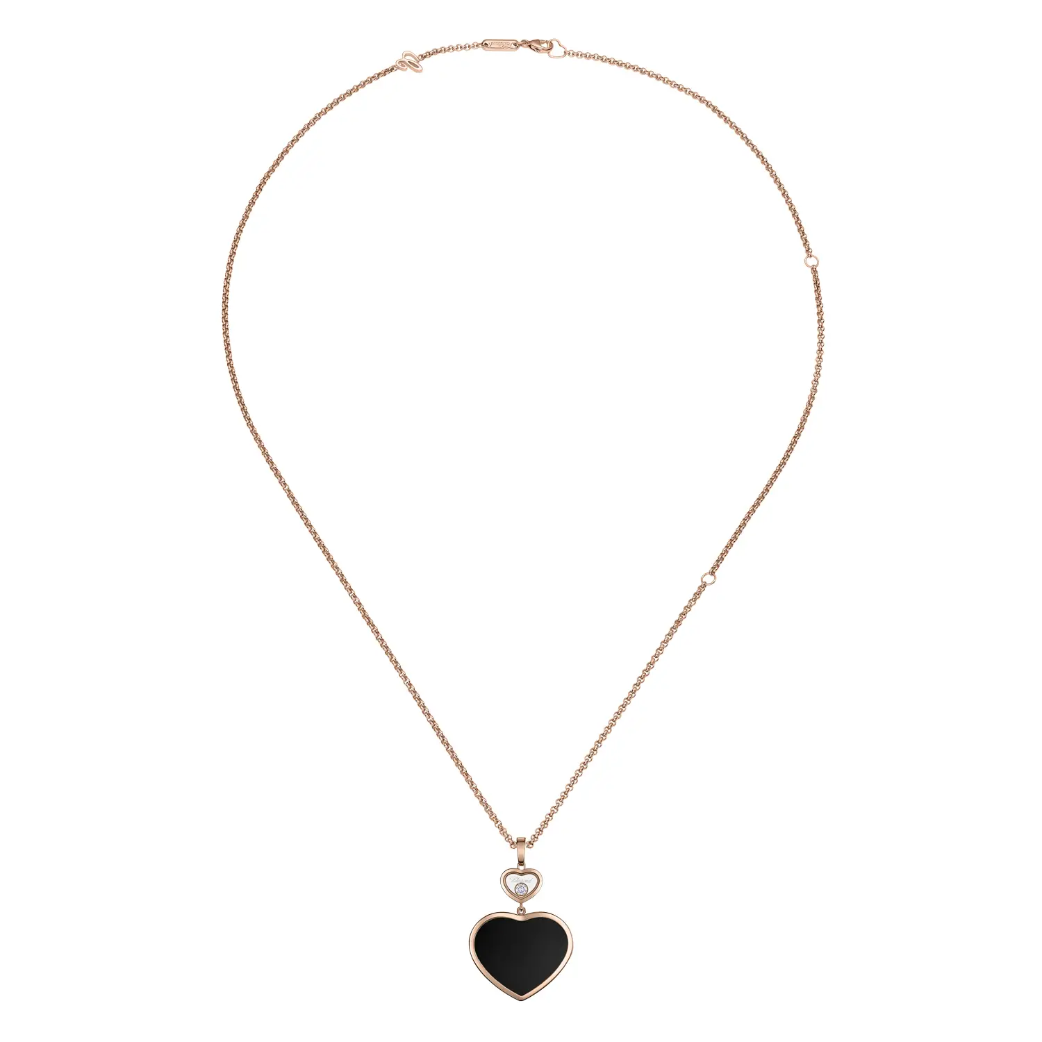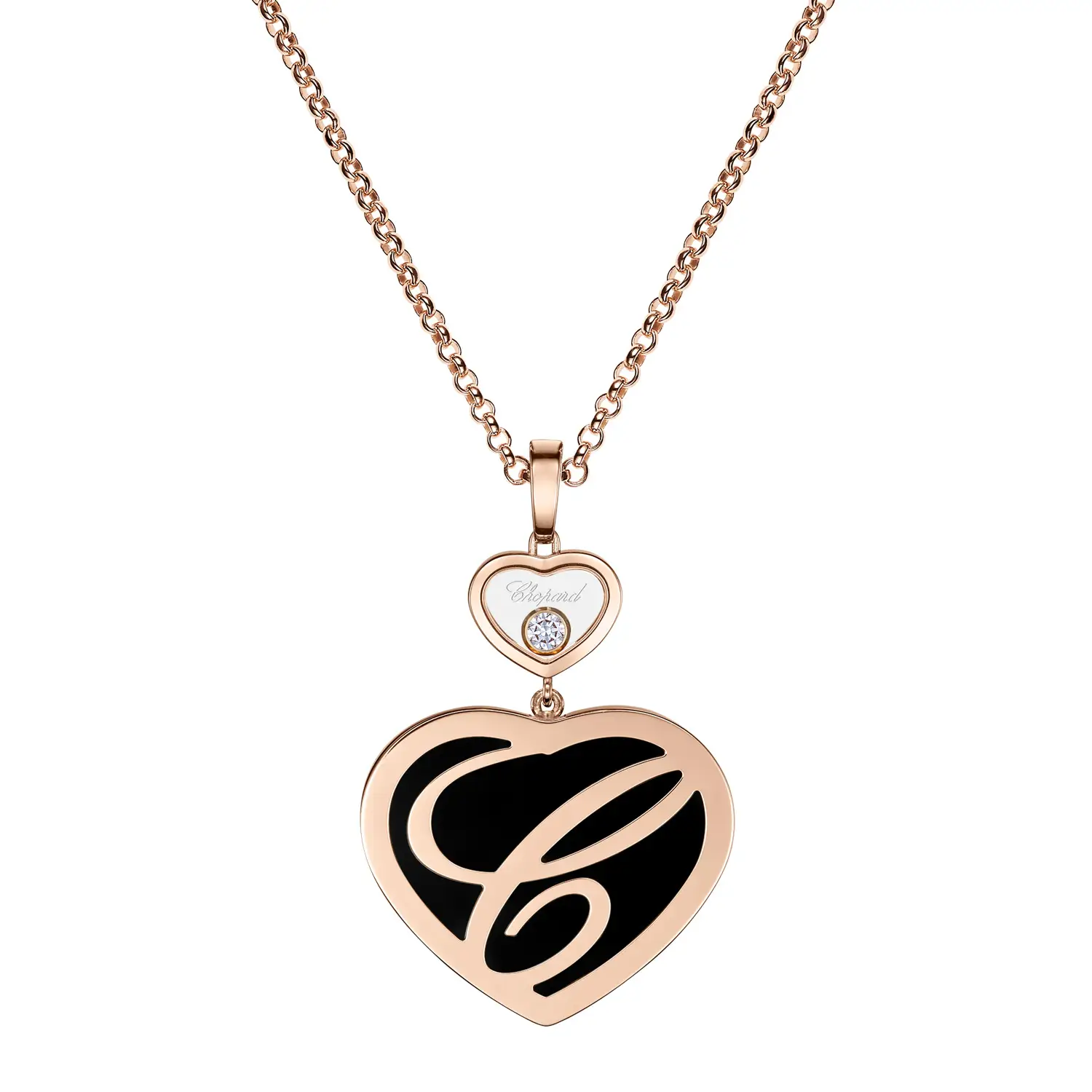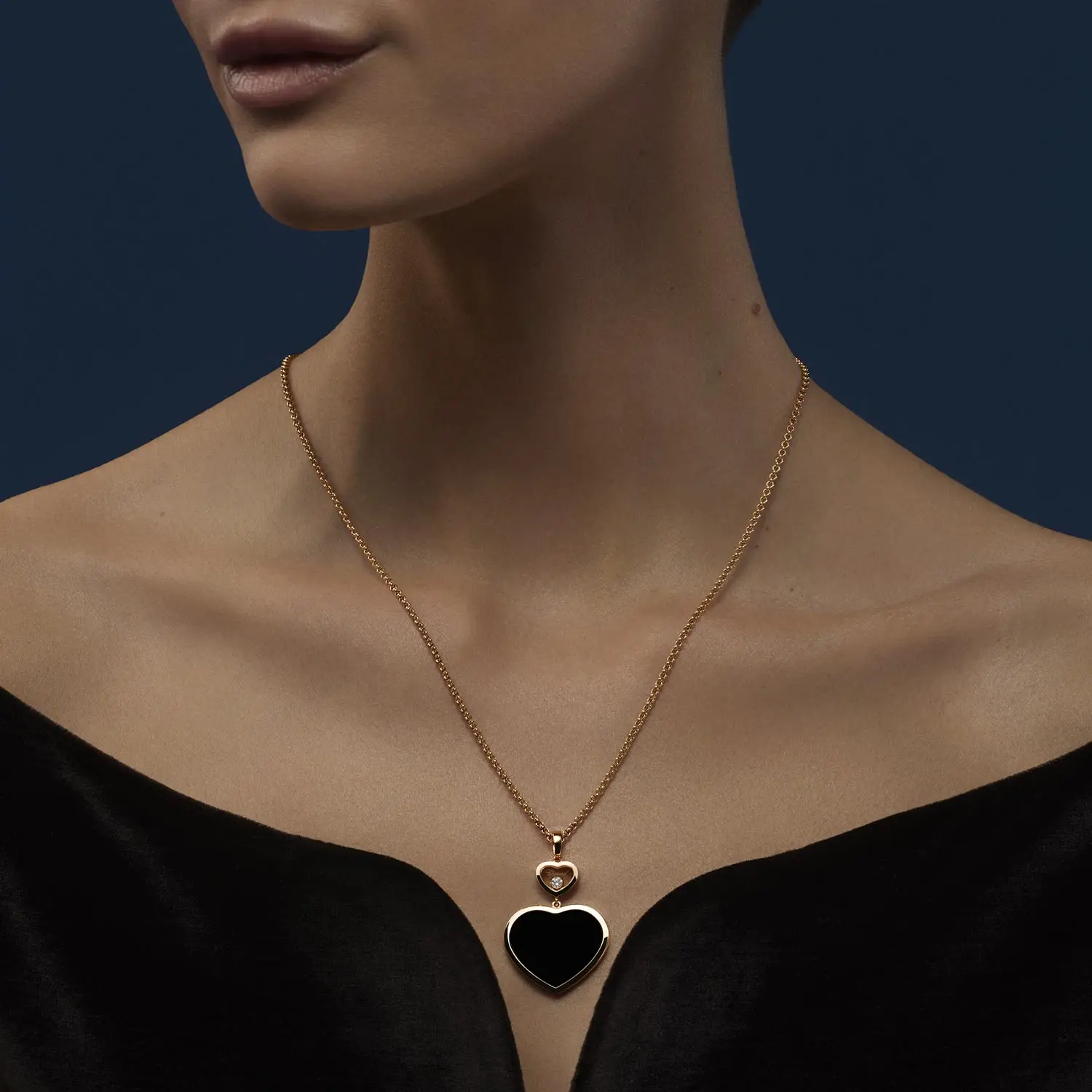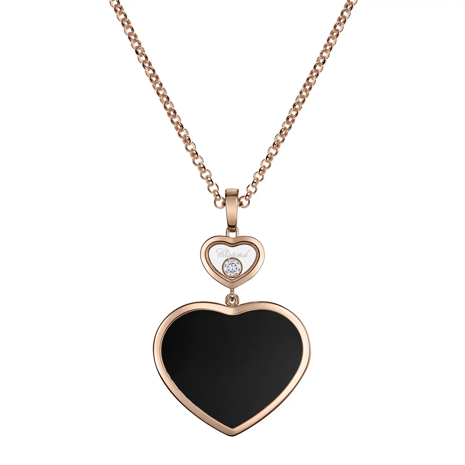 吊坠一侧镶嵌一颗醒目的天然心形黑玛瑙,深邃的黑色与玫瑰金温暖的色调形成优雅对比。另一侧装饰有一颗可自由滑动的钻石,嵌于较小的心形中。这颗天然圆形钻石拥有IF 净度和F-G 色级,呈现出非凡的光泽与闪耀。
