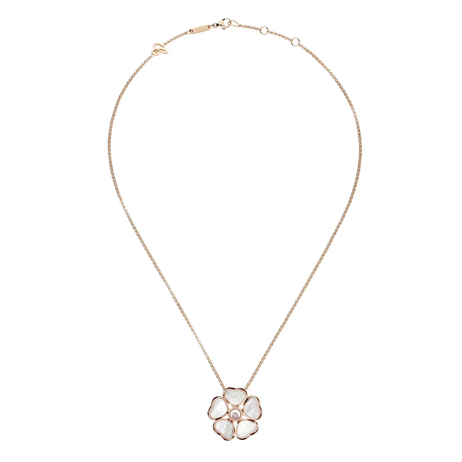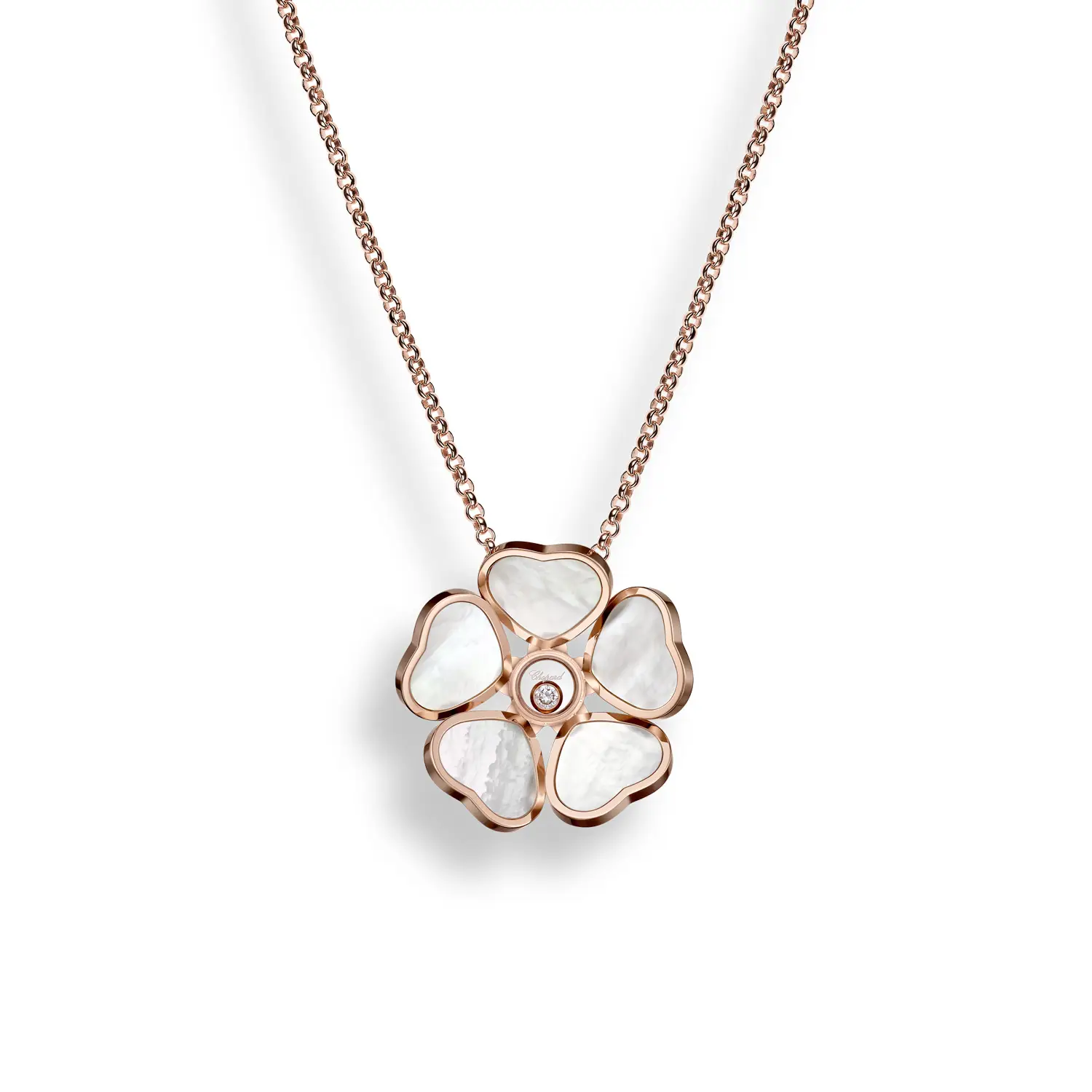 萧邦 Chopard Happy Hearts Flowers 79A085-5301 吊坠颂扬喜悦、爱情与女性优雅。采用 18K 道德玫瑰金 精制而成,花朵造型由 五个心形 组成,中心的 钻石可自由滑动,展现标志性的“舞动钻石”效果,象征自由与乐观。
