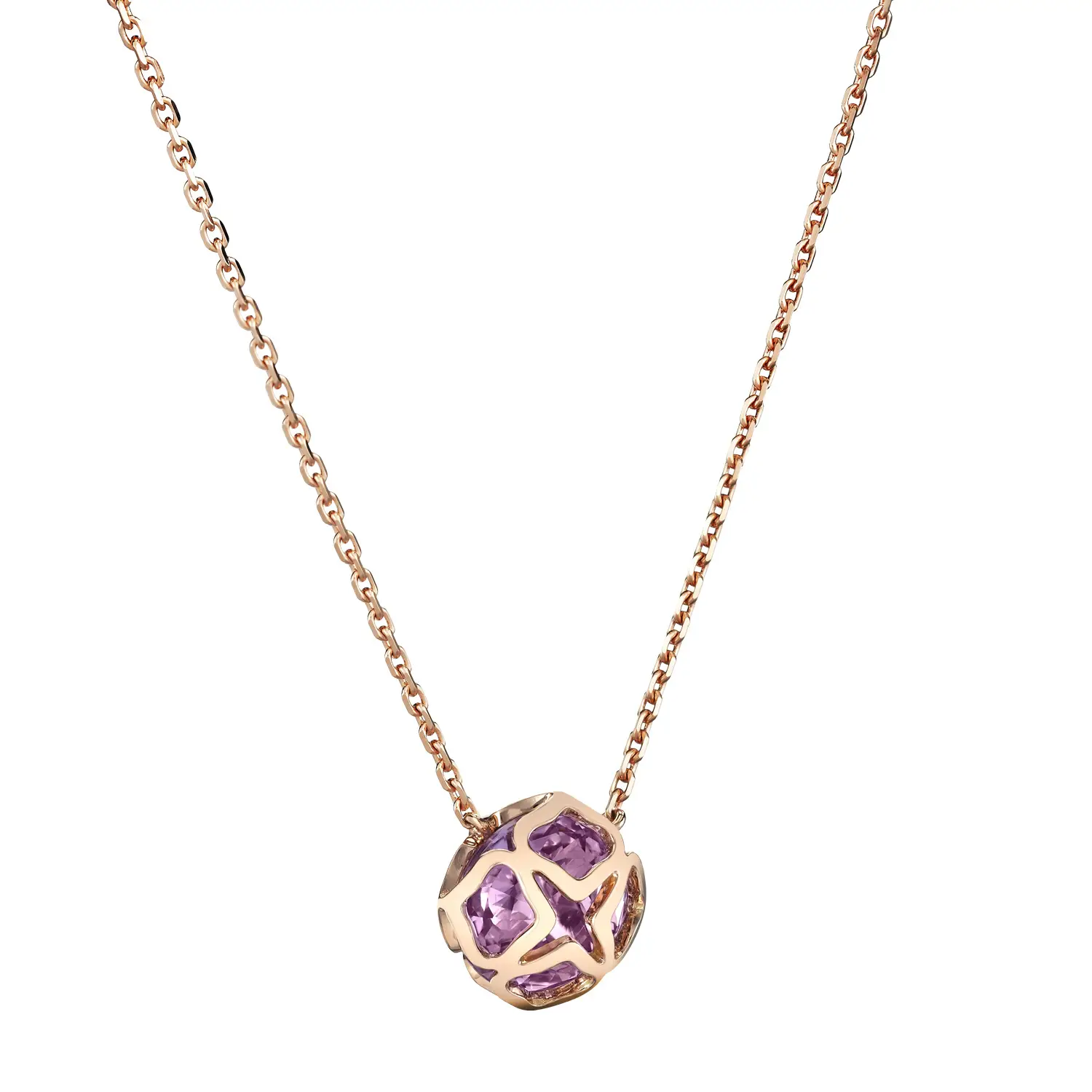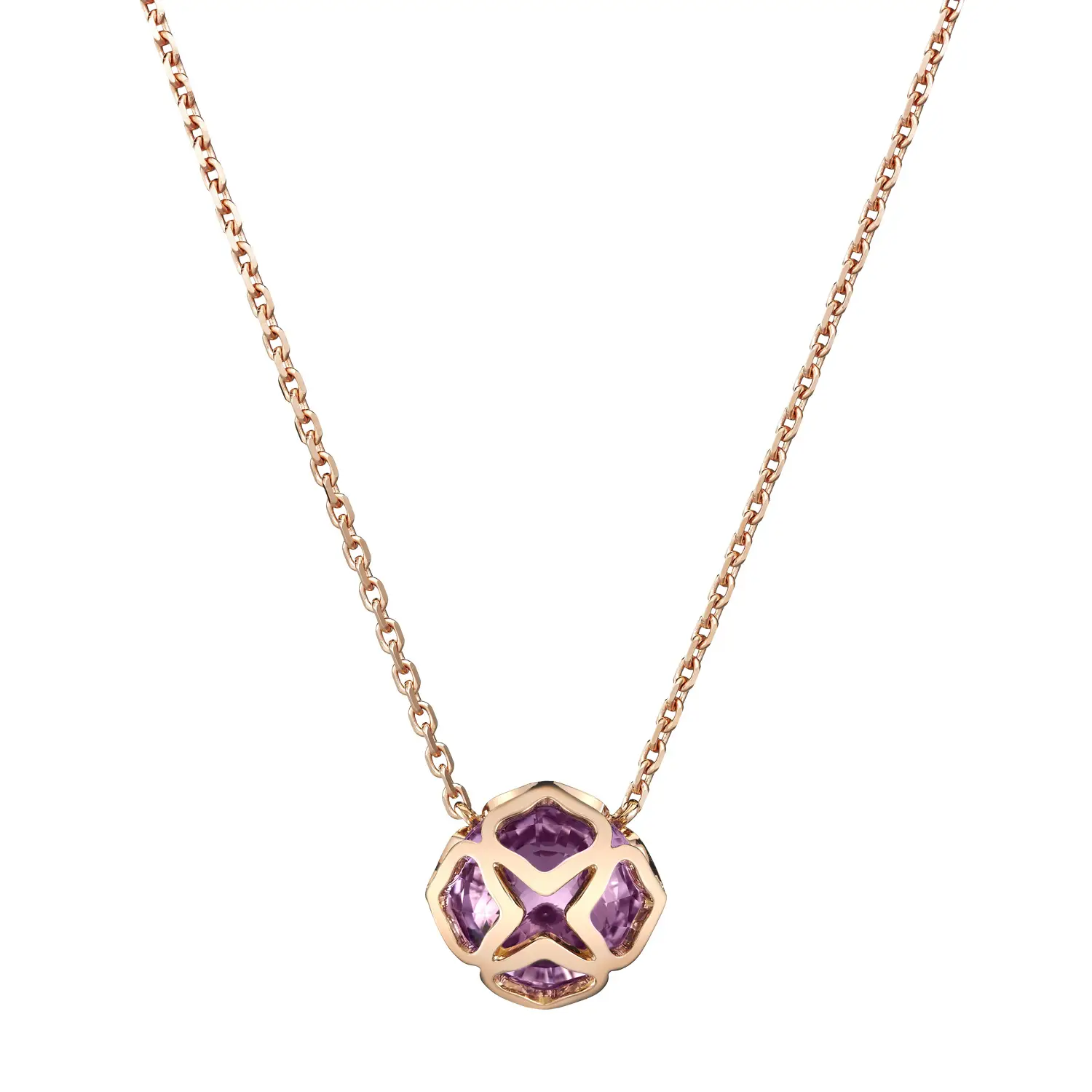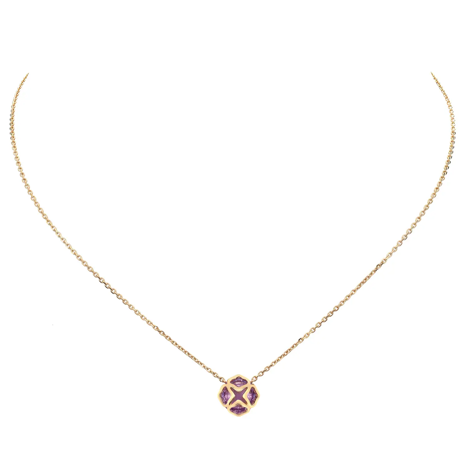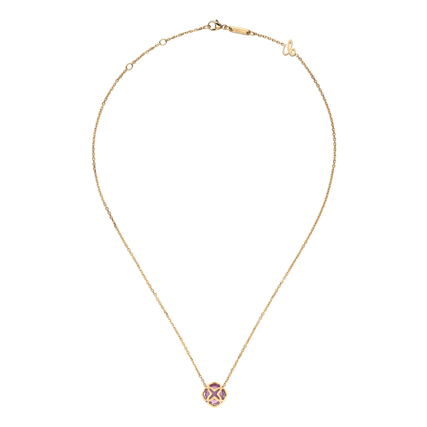 核心是一个令人惊叹的 天然紫水晶,枕形切割 (cushion),重量 2.74 克拉,其浓郁的紫色与精致切工为吊坠增添了庄重、华丽与珍贵的闪耀。这颗独特的宝石展现极简奢华,优雅镶嵌于贵金属之中。
