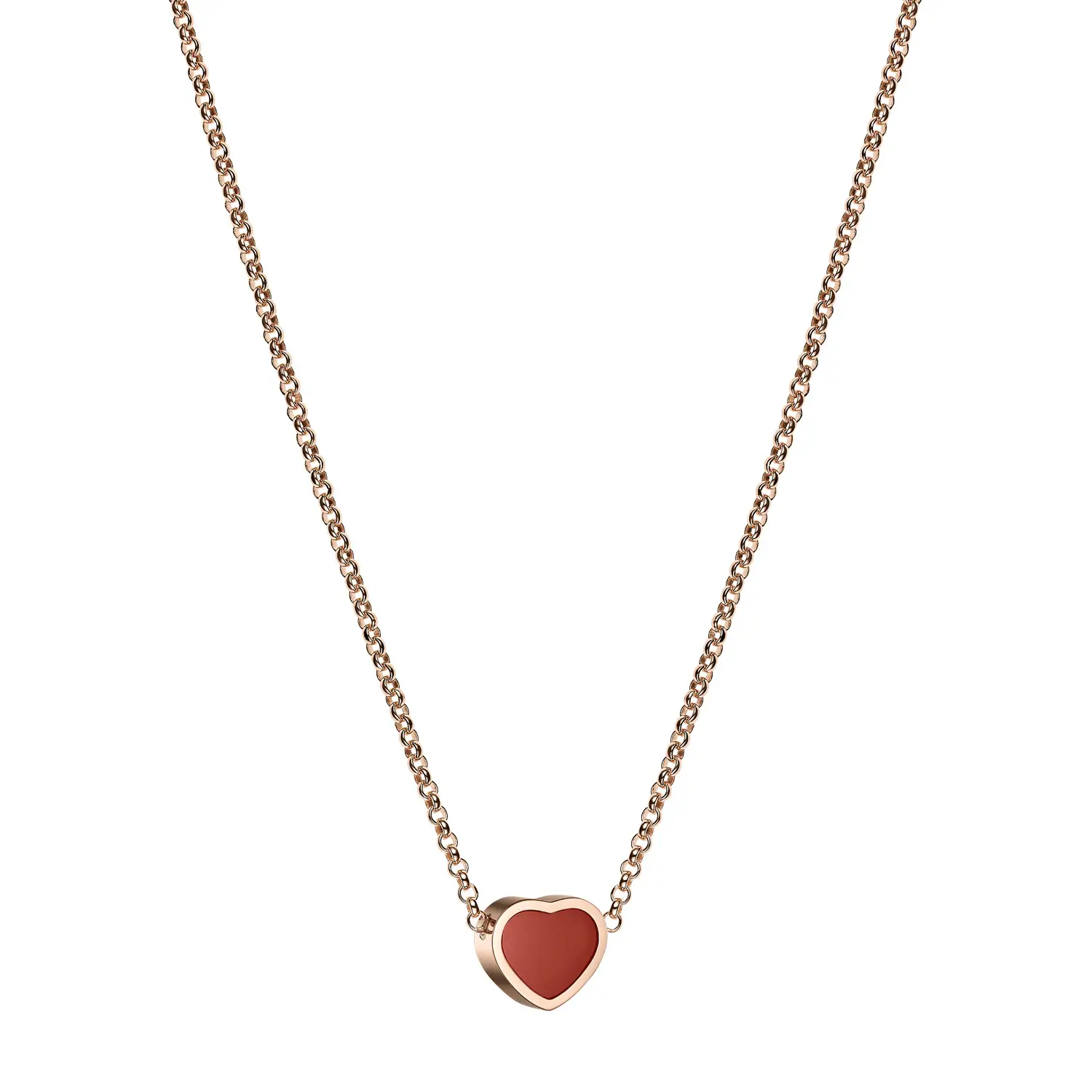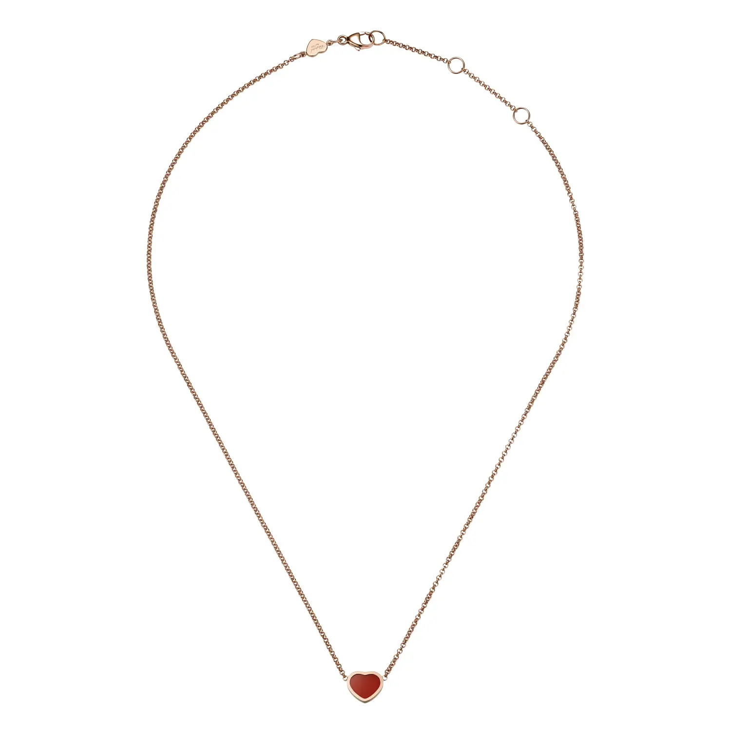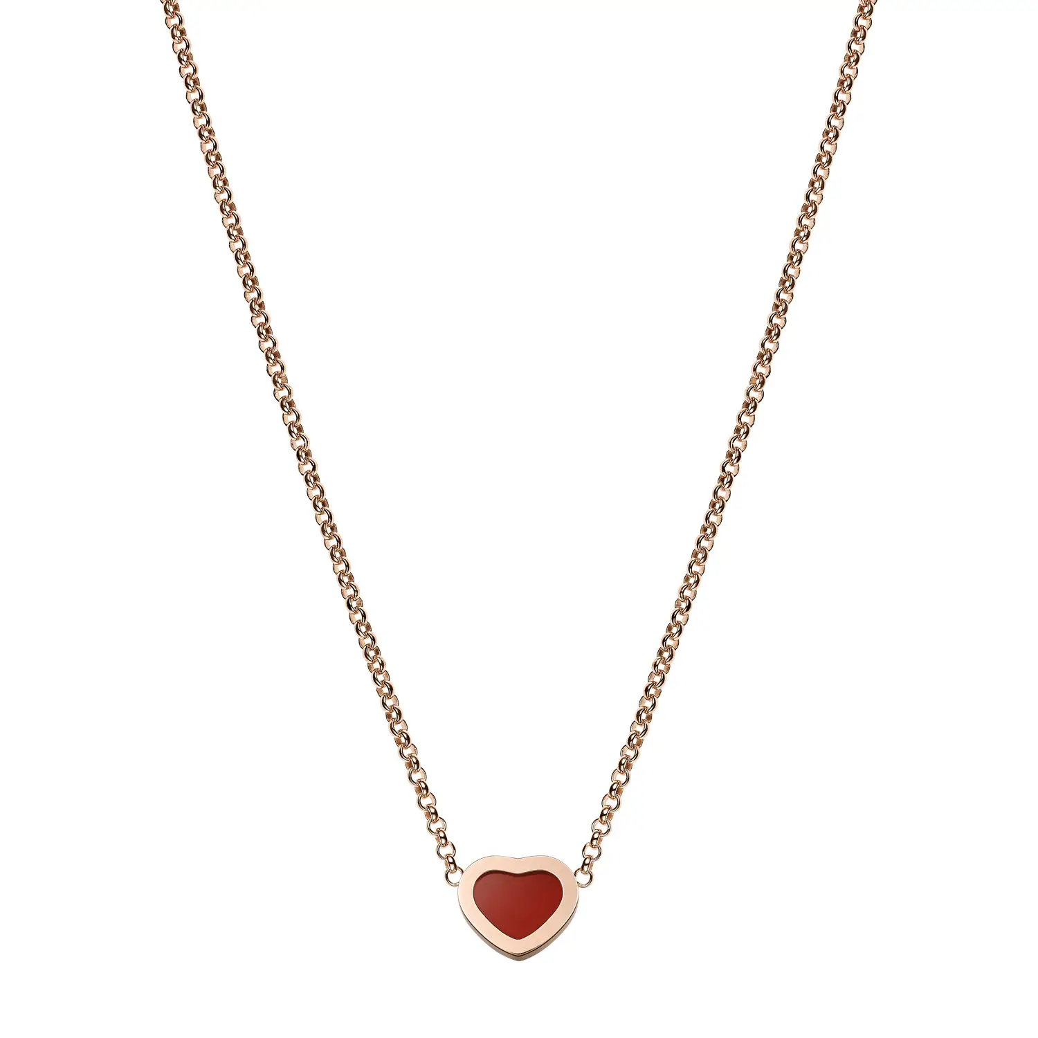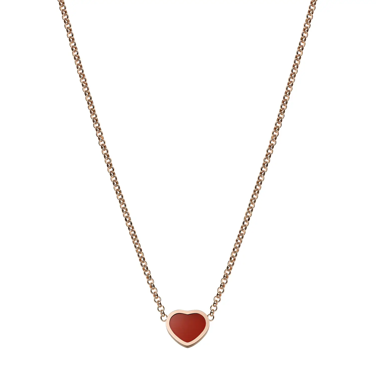 萧邦 Chopard My Happy Hearts 81A086-5801 项链以现代优雅方式诠释品牌经典风格。采用 18K 道德玫瑰金 精制而成,心形吊坠镶嵌 红玉髓,象征热情、勇气与积极能量。极简设计展现 My Happy Hearts 系列 精神——以小小幸福符号诉说个人故事。