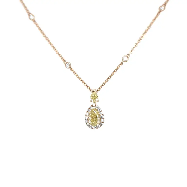 中央主石为一颗天然黄彩(Fancy Yellow)钻石 0.71 克拉,梨形切工 7.00 × 4.60 mm;并配有一颗较小的天然黄彩钻 0.23 克拉,4.10 × 3.10 mm,同为梨形。温暖色调与26 颗天然白钻总重 0.40 克拉的密钉镶形成优雅对比,圆形切工(1.00–2.00 mm),净度 VS,颜色 F。精妙的彩钻组合,成就一款凸显女性魅力、优雅与非凡气质的精致珠宝。