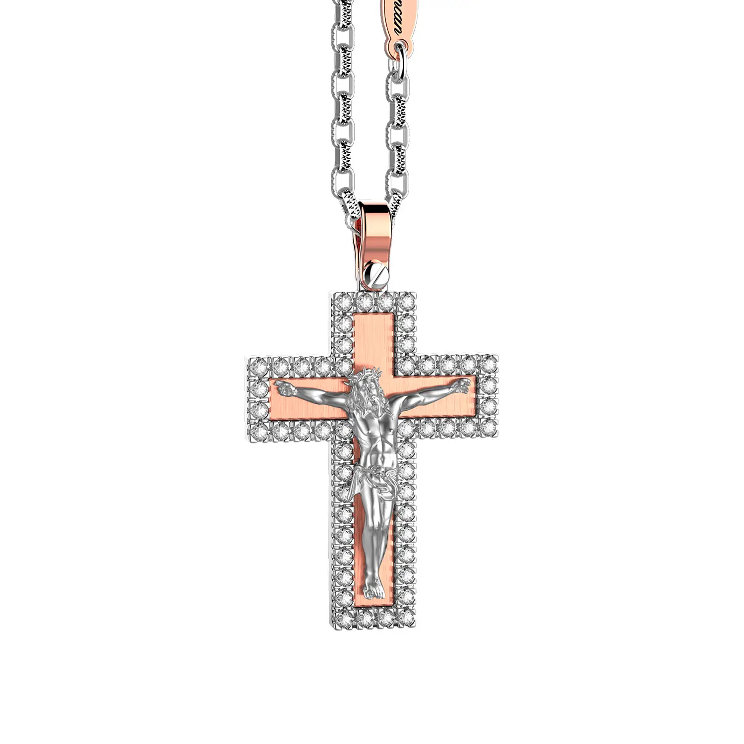 Zancan Couture EC901RB 吊坠以现代设计承载个人信仰象征。采用 **18K 金(750/1000)打造,白金与玫瑰金双色(bicolor)并置,形成精致的亮面 / 哑光对比;以十字(宗教)**为主题,并配 60 厘米项链,适合日常亦契合重要时刻。