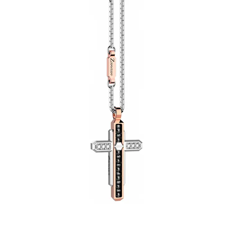 Zancan EC805BR60 为醒目的吊坠,将现代意式设计与个人信仰符号相结合。采用 18K 金(750/1000)打造,白金与玫瑰金双色(bicolor)并配抛光处理,点缀经典十字(宗教)元素。均衡比例与60 厘米长度带来从早到晚的舒适佩戴,轻松适配休闲与正装。