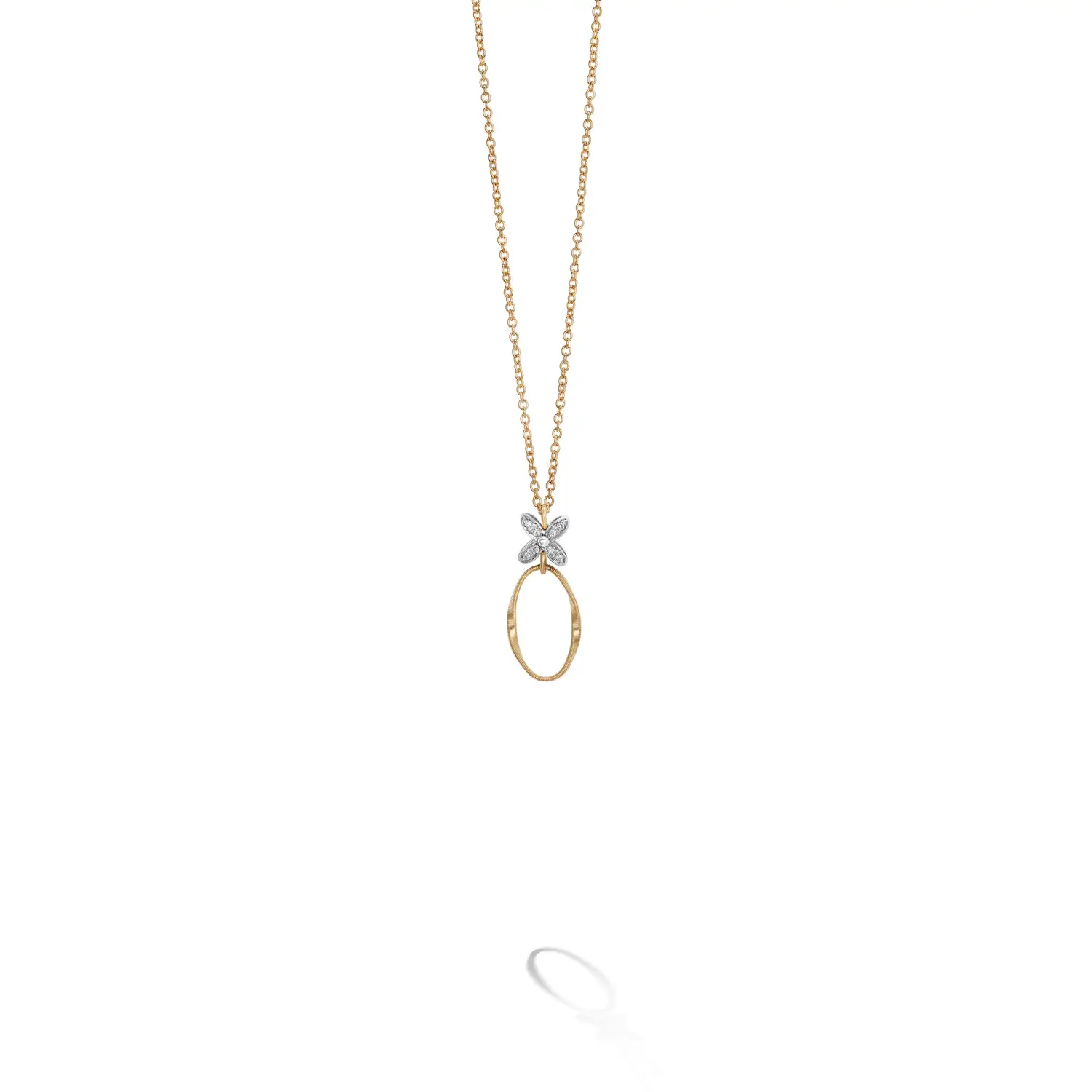 Marco Bicego Marrakech Onde CG830 B3 YW 吊坠融合意大利珠宝工艺与现代优雅。采用 18K (750/1000) 双色黄金 制成,结合 哑光表面处理,散发自然奢华气息。吊坠尺寸为 29 × 12 mm,链长 42 cm,佩戴时恰到好处地贴合颈部。