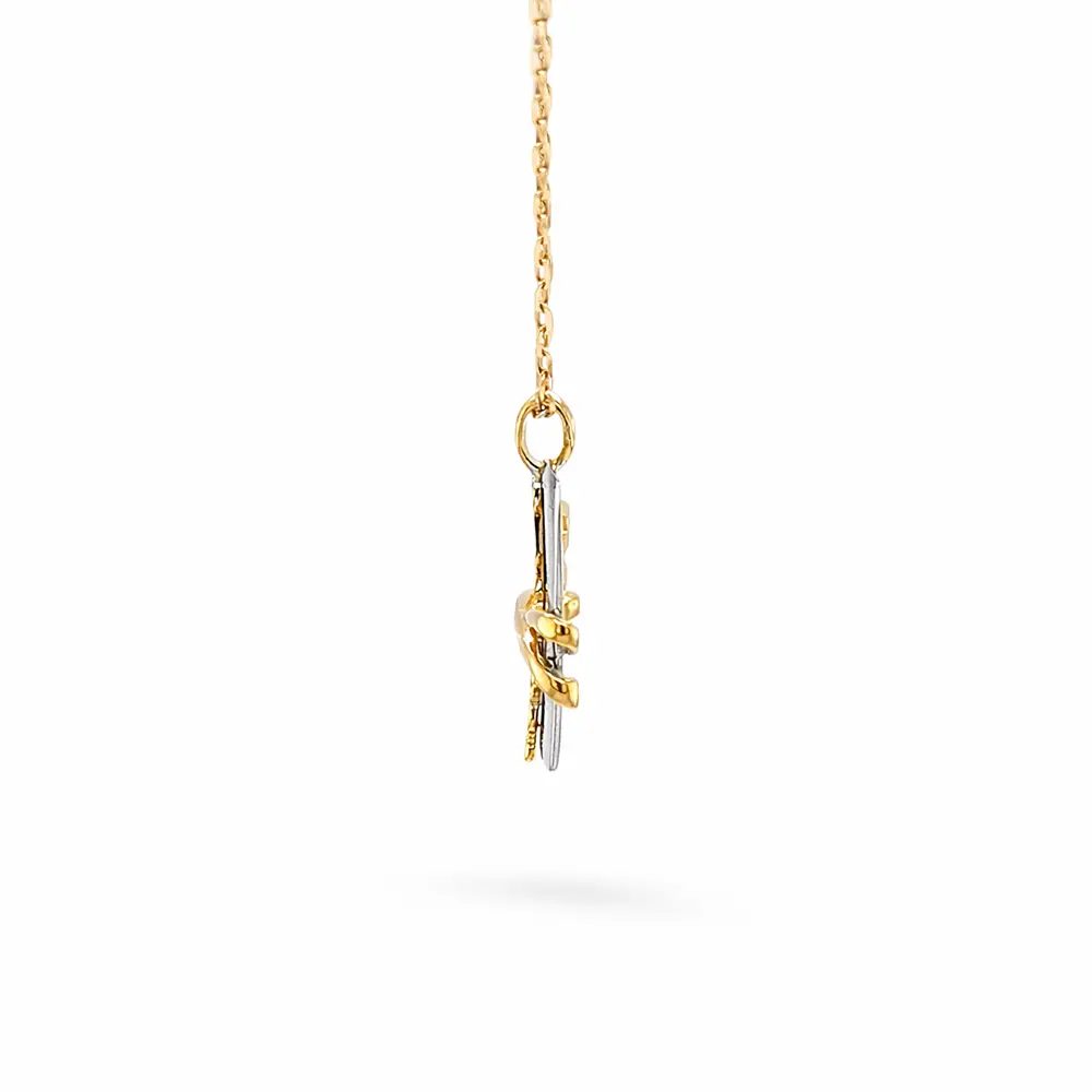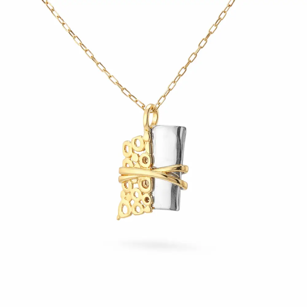 这款金质花丝纹样吊坠以精致的工艺和装饰性的镂空结构脱颖而出,整体轻盈而优雅。细腻成型的线条营造出迷人的视觉效果,并在佩戴时展现黄金自然的光泽。