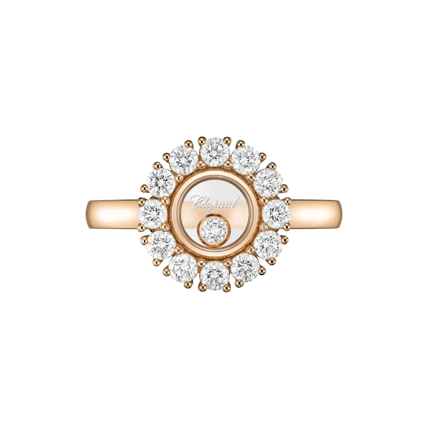 这款源自 Happy Diamonds Icons 系列的戒指采用 18K 道德玫瑰金打造,呈现温暖而高级的光泽。设计核心是 Chopard 标志性的元素——在两块蓝宝石水晶之间自由滑动的钻石。其轻盈流畅的运动营造出独特的光影效果,象征着喜悦、自由与灵动优雅。