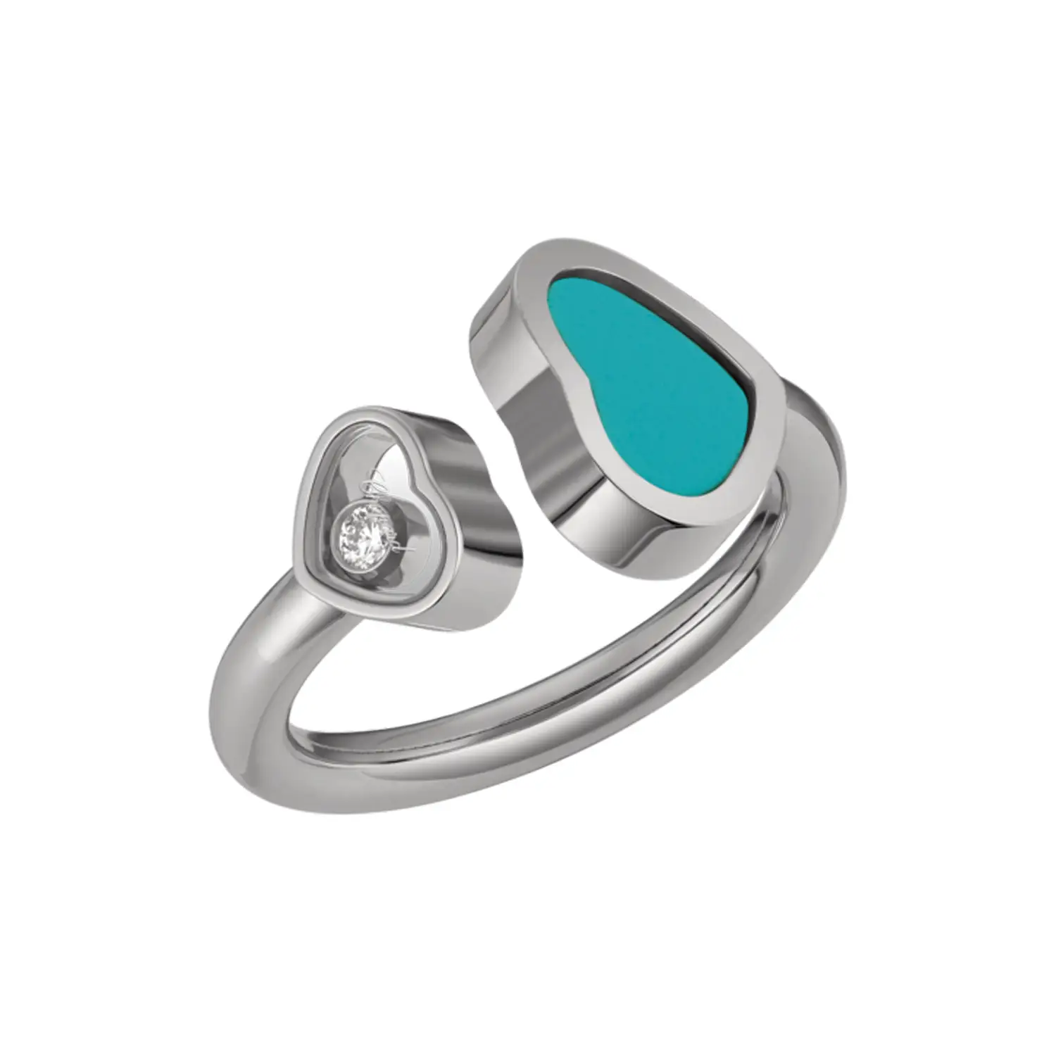 这款 Chopard Happy Hearts 829482-1408 戒指融合了欢乐与现代优雅。采用 18K 白金 制成,饰以 绿松石心形图案 及品牌标志性的 会“跳动”的钻石(约 0.05 克拉),钻石在两片蓝宝石水晶之间自由闪耀。