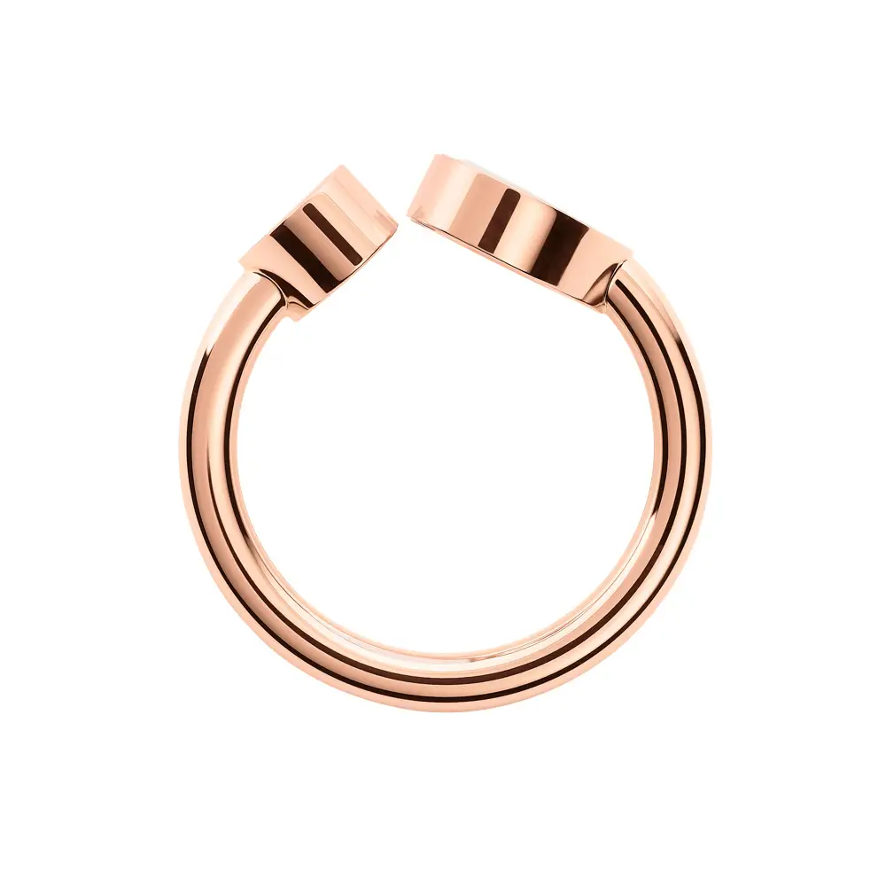 每一个细节都体现了 瑞士 Chopard 珠宝工艺的极致精湛 —— 抛光的玫瑰金映衬出一颗 0.04 ct 钻石(颜色 F-G,净度 IF-VVS),而珍珠母的光泽增添了柔和的温暖对比。这枚戒指是优雅、俏皮与永恒奢华的完美结合,展现出独立女性的迷人风采。