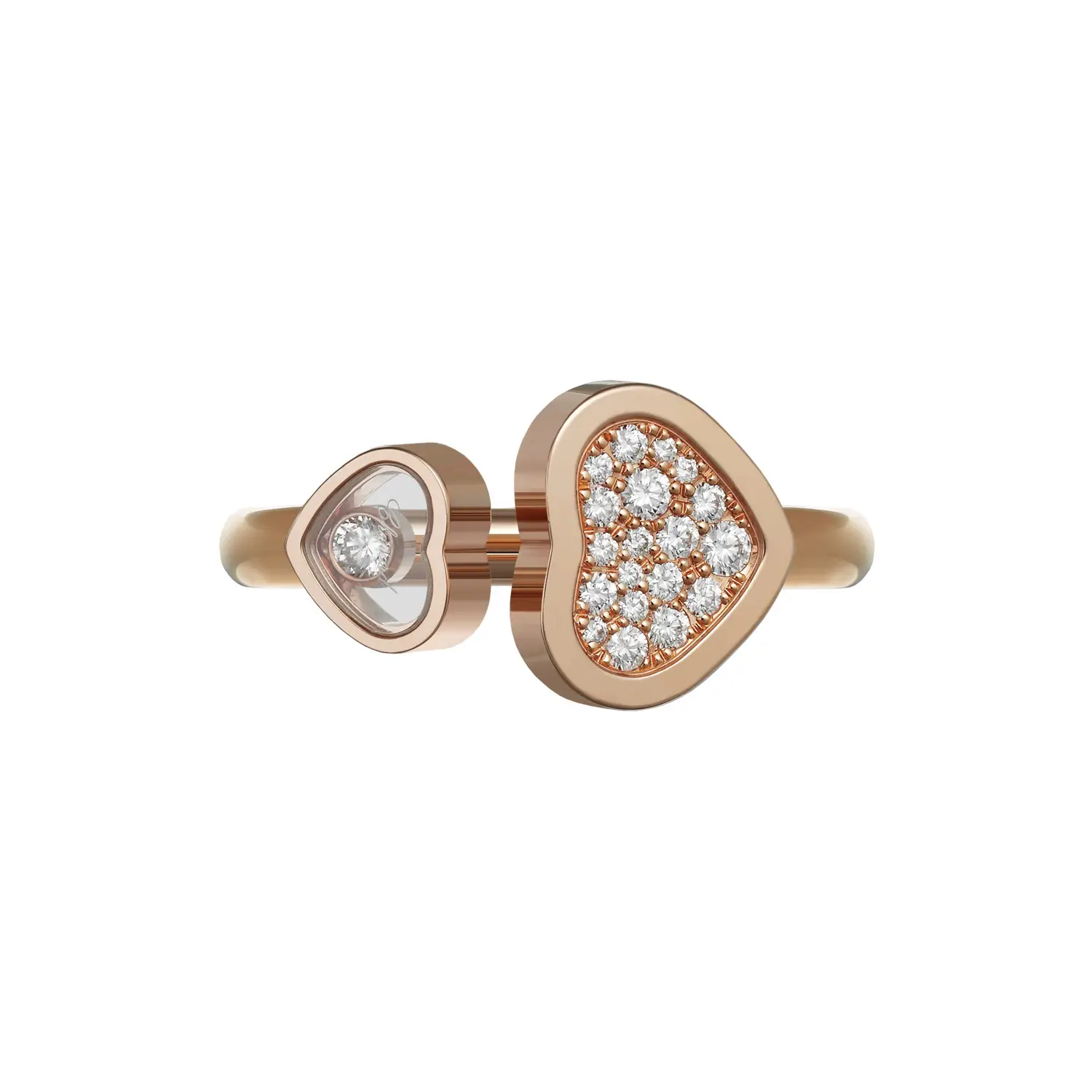 萧邦 Chopard Happy Hearts 829482-5918 戒指融合了 Happy Hearts 系列的活力与玫瑰金的优雅。采用 18K 道德玫瑰金 制成,镶嵌两个心形图案——一个象征爱与和谐,另一个内含 可自由转动的钻石,随着动作闪耀光芒。