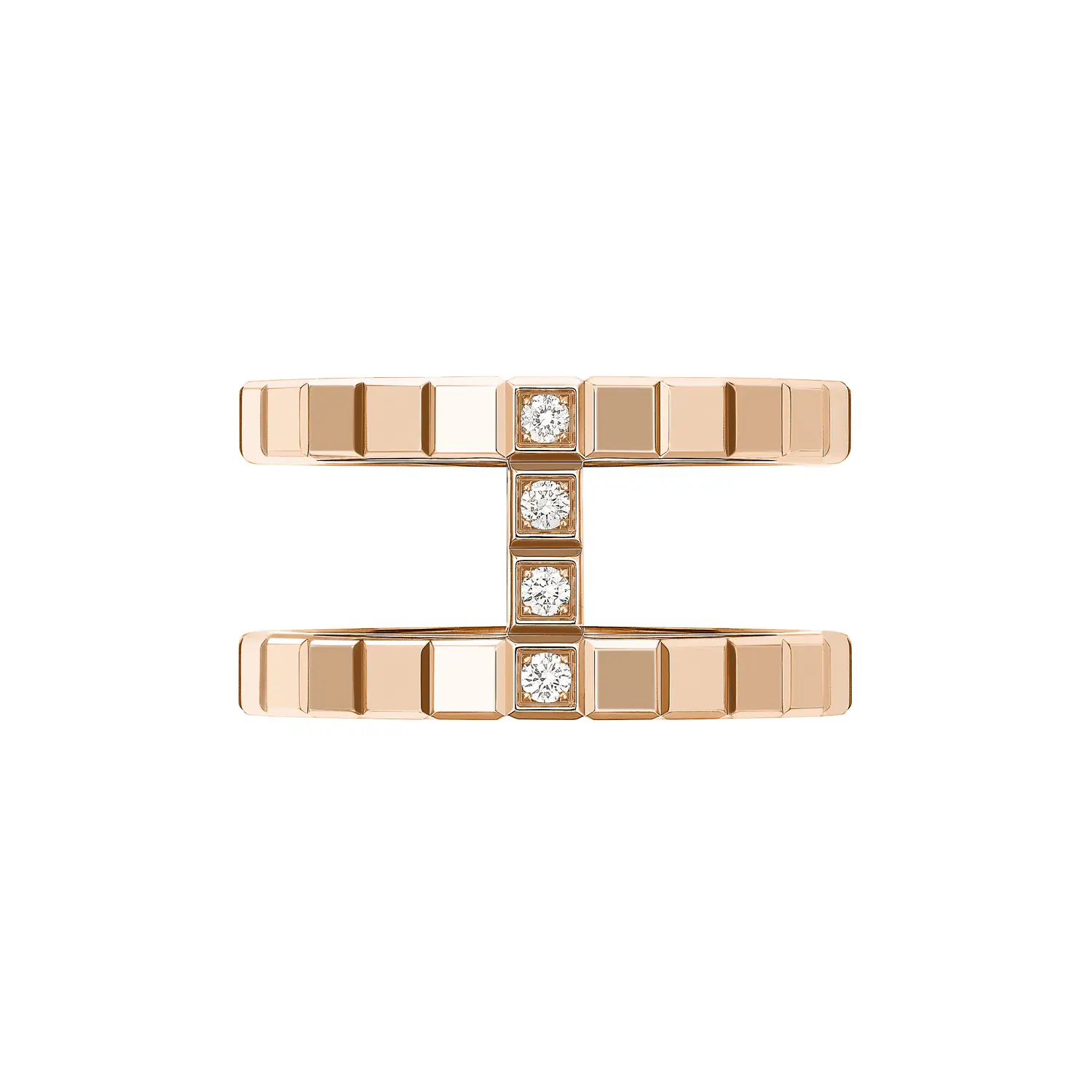 这款 Chopard Ice Cube 戒指采用 18K 道德玫瑰金打造,完美融合精准设计与现代简约之美。立方体灵感的标志性造型散发出和谐、纯净与柔和光泽。抛光切面在每一个角度都能捕捉光线,而总重约 0.04 克拉 的钻石则增添了细腻却迷人的闪耀。